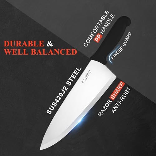 The 10-Inch High Carbon Chef Knife from Bolexino is designed for professional precision and versatility. Crafted from Japanese high-carbon stainless steel SUS420J2, this razor-sharp kitchen knife is ideal for chopping, slicing, dicing, and mincing vegetables, fruits, meats, and more. Its extra length provides superior leverage and cutting power for both household and business kitchens.