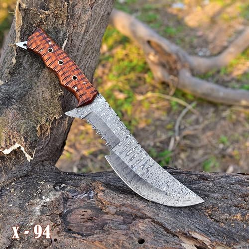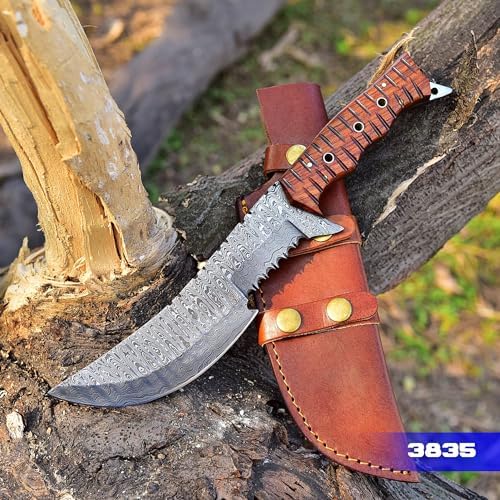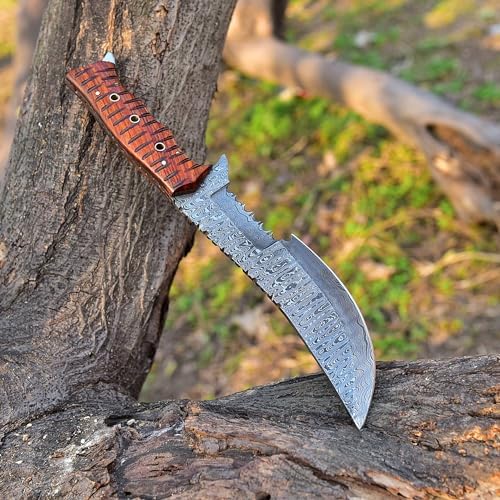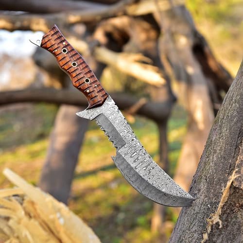 This tracker hunting knife delivers exceptional performance in the field. Its razor-sharp Damascus blade cuts with precision, while the ergonomic wood handle ensures comfort even in wet conditions. With versatile survival tools included, it’s a complete outdoor companion for hunters, campers, and adventurers.