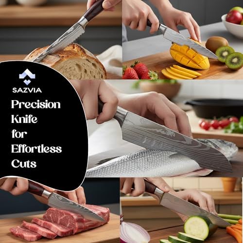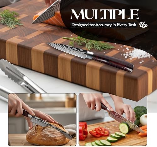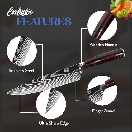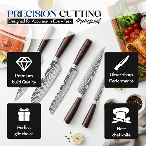 The kitchen knife set of 5 is a premium collection designed for all your culinary needs. Featuring high carbon stainless steel blades and durable Pakkawood handles, this set combines elegance with unmatched sharpness. Perfect for chopping, slicing, and dicing vegetables, fruits, meats, and baked goods.