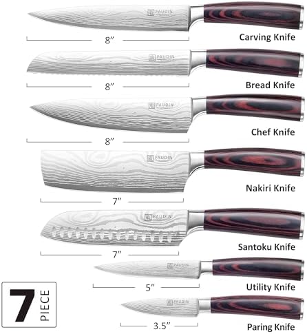 7-piece set includes 8″ chef knife, 8″ bread knife, 7″ santoku, 7″ nakiri, 8″ carving knife, 5″ utility knife, 3.5″ paring knife