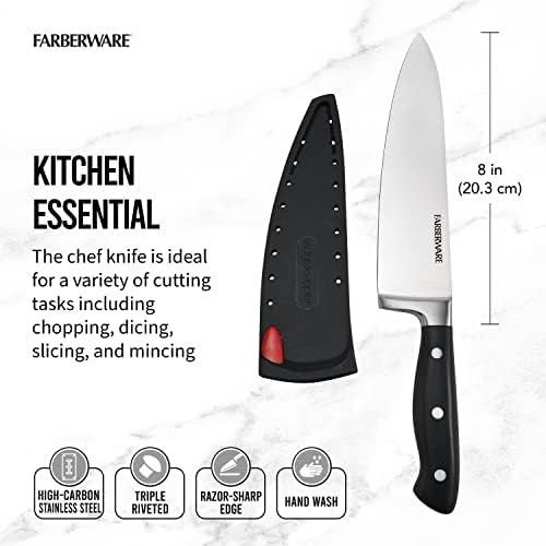 The 8-inch forged chef knife with self-sharpening blade cover is engineered for professional-level performance in any kitchen. Designed with high-carbon stainless steel, a triple-riveted ergonomic handle, and Edgekeeper technology, it offers precision, reliability, and effortless cutting for all cooking tasks.
