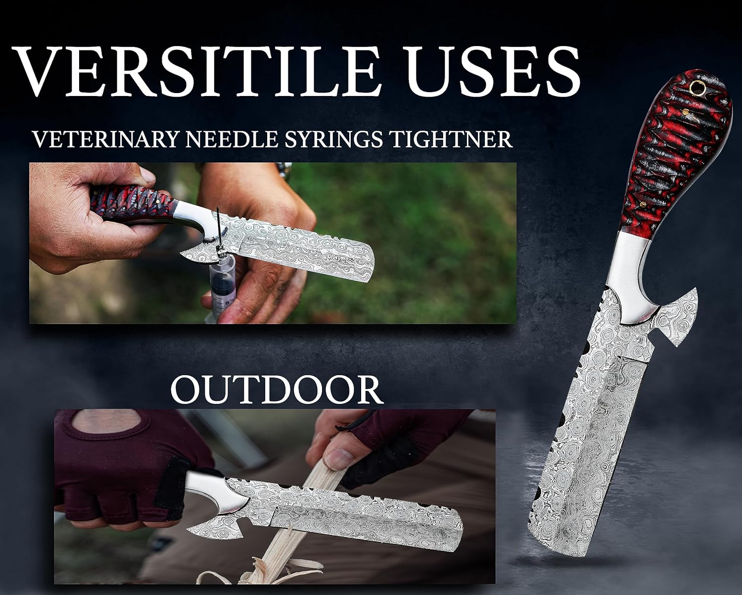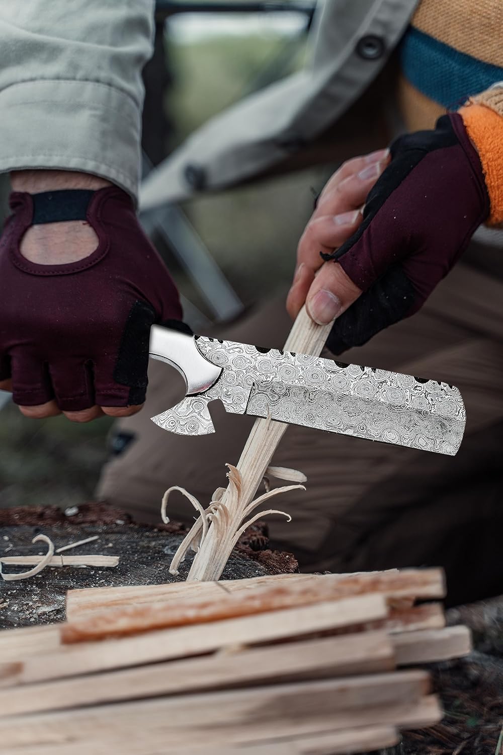 The Damascus Knife provides unmatched cutting precision for outdoor tasks. Its razor-sharp blade excels in skinning, wood carving, rope cutting, and camping chores. Ergonomic handle and lightweight design reduce hand fatigue, making it ideal for all-day hunting or bushcraft activities.