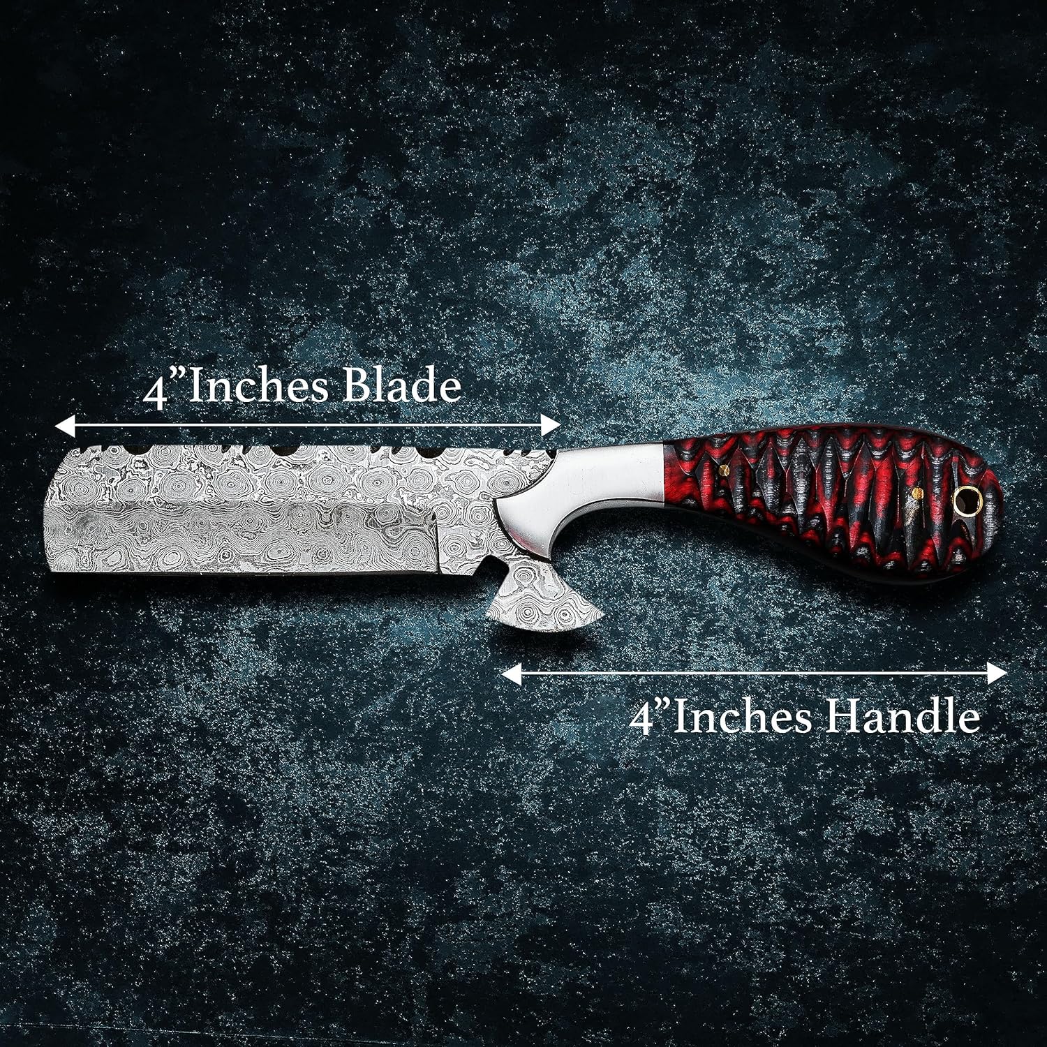 8″ overall length: 4″ blade and 4″ handle, 4mm thick blade