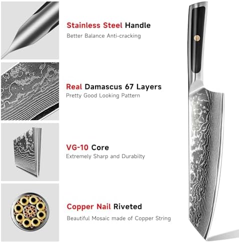This chef knife 8 inch is crafted for precision, power, and everyday versatility in the kitchen. Featuring a VG10 Japanese super steel core wrapped in 67 layers of Damascus stainless steel, it delivers exceptional sharpness, balance, and corrosion resistance. Designed for both home cooks and professional chefs, it transforms daily food prep into a refined cutting experience.