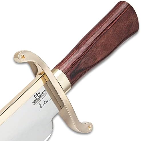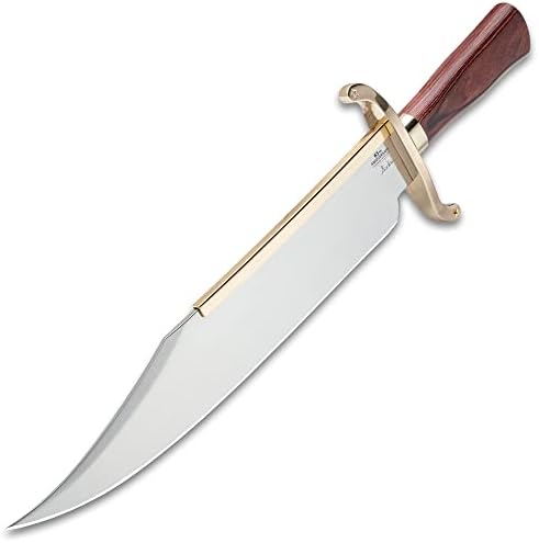 This Bowie knife is a masterfully crafted piece by Gil Hibben, blending artistry with hard-use functionality. Featuring a 14-inch high-polish clip point stainless steel blade and a striking wooden handle with gold-plated handguard accents, it’s both a reliable outdoor tool and a statement collector’s knife.