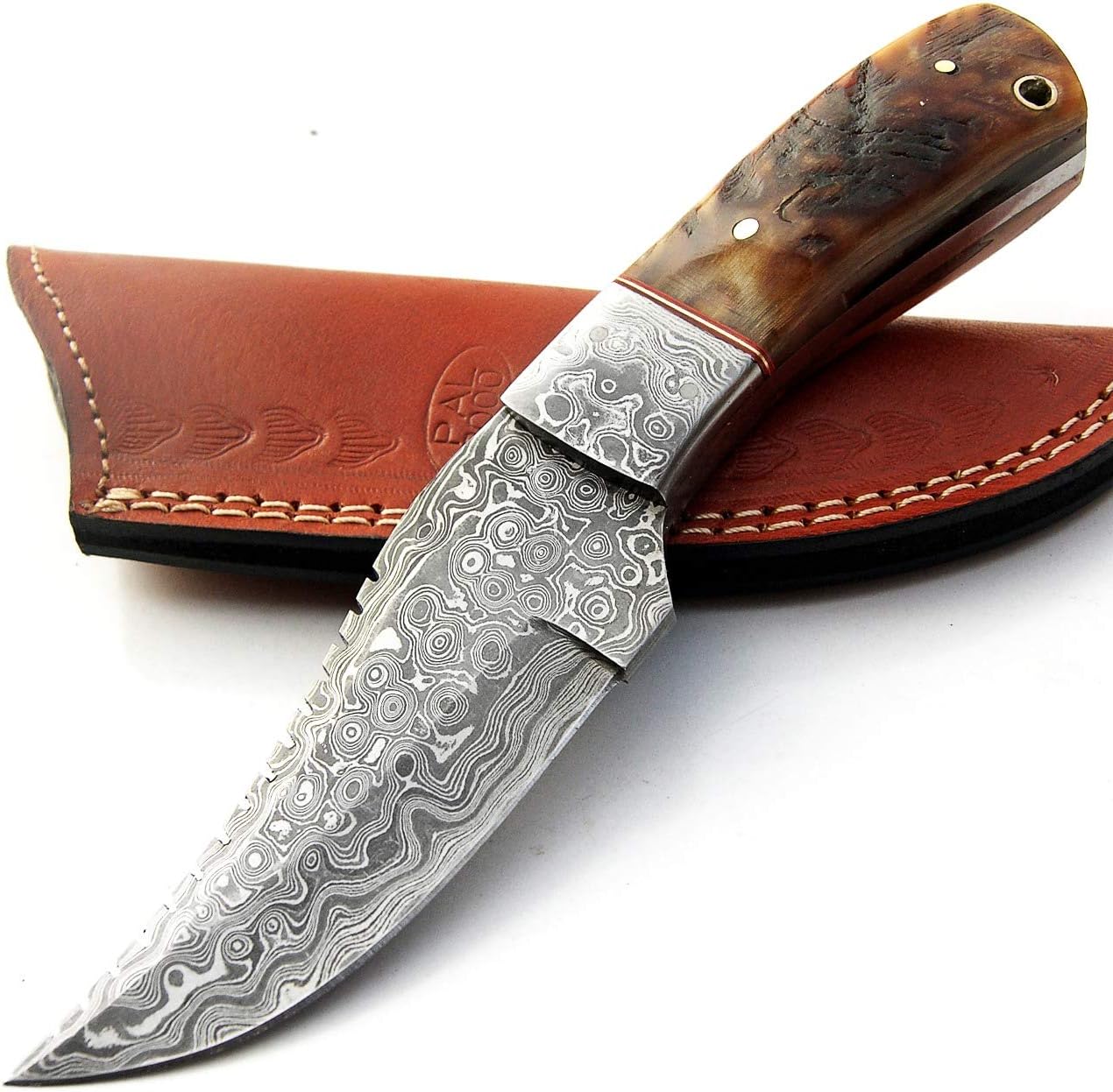 The Damascus Bowie Knife features a 9-inch full tang blade with a ram horn handle for superior grip. Handmade from Damascus steel, this hunting and survival knife comes with a premium leather sheath, offering durability, sharpness, and style for outdoor adventures or EDC purposes.