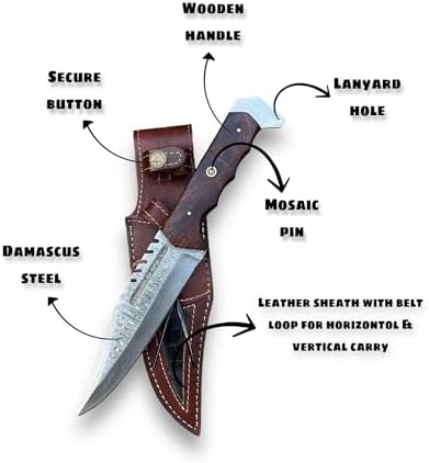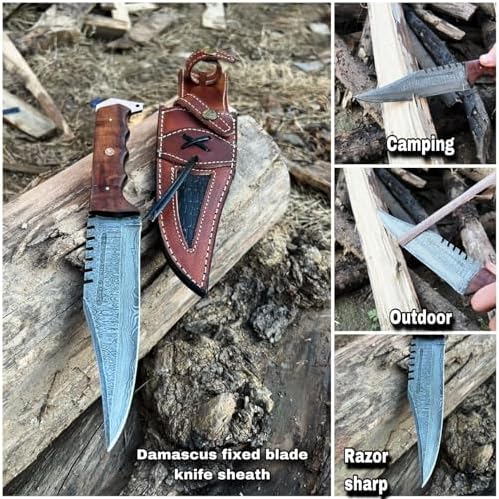 Custom Handmade Damascus Hunting Knife Bowie 12 Inch | Mega BladesProduct Overview Focus Keyword: Custom Handmade Damascus Hunting Knife Crafted by skilled artisans, this custom handmade Damascus hunting knife blends traditional forging techniques with modern outdoor performance. Featuring a powerful Bowie-style fixed blade, genuine Damascus steel construction, and a refined rosewood handle, it is built for serious outdoor use and premium presentation. Features Focus Keyword: Custom Handmade Damascus Hunting Knife Hand-forged Damascus steel blade with striking ladder pattern Forged from 1095 and 15N20 high-carbon steel for strength Full tang construction ensures balance and durability Ergonomic rosewood handle with natural contours Leather sheath supports both horizontal and vertical carry Ideal for hunting, camping, survival, and outdoor adventures Specifications Focus Keyword: Custom Handmade Damascus Hunting Knife Overall Length: 12 inches Blade Length: 7 inches Handle Length: 5 inches Blade Material: Damascus Steel (1095 & 15N20) Blade Layers: 288 Hardness: 56–58 HRC Handle Material: Natural Rose Wood Knife Weight: 8.6 oz (315 g) Knife Type: Fixed Blade Bowie Sheath: Leather with Belt Loop (Horizontal & Vertical Carry) Benefits Focus Keyword: Custom Handmade Damascus Hunting Knife This knife delivers exceptional cutting performance with lasting edge retention. The balanced Bowie blade handles demanding outdoor tasks with ease, while the natural rosewood handle provides comfort and control, making it ideal for extended use in hunting and survival environments. Unique Selling Points Focus Keyword: Custom Handmade Damascus Hunting Knife Authentic hand-forged Damascus steel craftsmanship Visually striking ladder pattern with functional strength Dual-carry leather sheath enhances versatility Full tang design built for rugged outdoor performance Premium gift-worthy knife for men and women Care Instructions Focus Keyword: Custom Handmade Damascus Hunting Knife Clean and dry the blade after each use. Apply a light coat of oil to protect the high-carbon Damascus steel from moisture. Store in a dry environment and avoid prolonged exposure to humidity to preserve blade integrity. Warranty / Quality Assurance Focus Keyword: Custom Handmade Damascus Hunting Knife Each knife is individually handcrafted and inspected for quality, balance, and performance. Built with attention to detail and premium materials, it is designed to deliver lasting reliability for outdoor enthusiasts and collectors alike.
