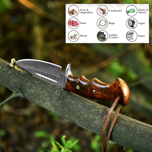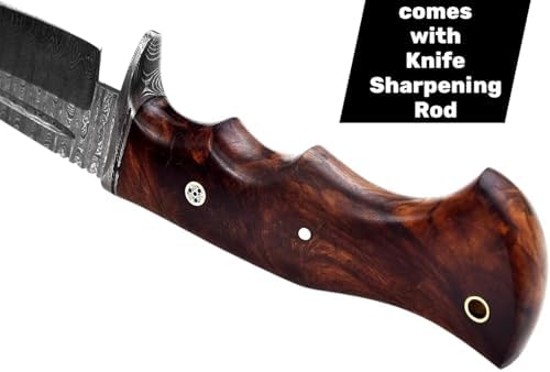 The Custom Handmade Damascus Steel Knife is a precision-crafted tool built for serious outdoor enthusiasts, hunters, and collectors. Hand-forged using premium Damascus steel, this knife delivers exceptional sharpness, durability, and visual character. Its full-tang construction and natural wooden handle ensure strength, balance, and control, making it ideal for camping, bushcraft, survival, and field use. Complete with a protective sheath, this knife is both functional and refined.