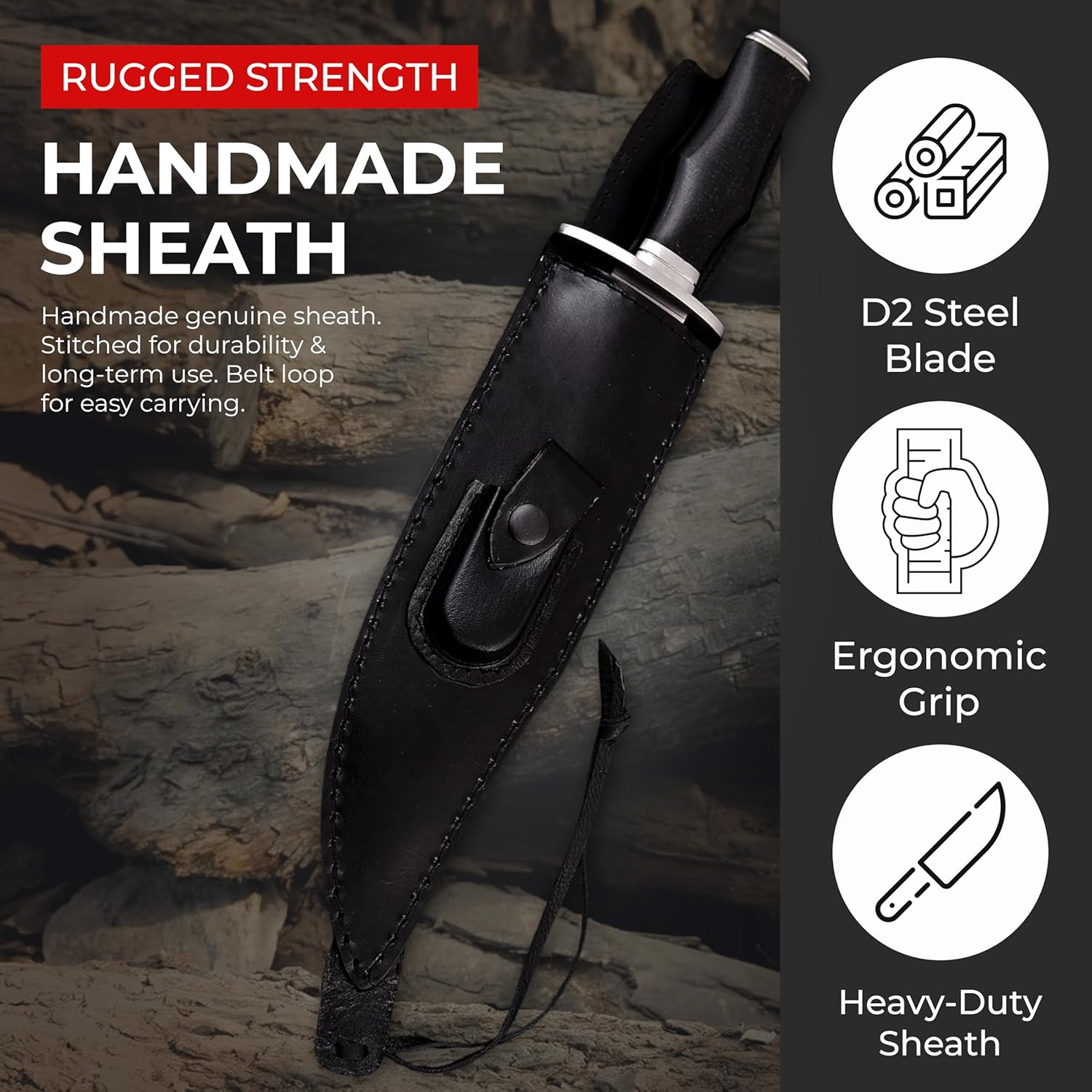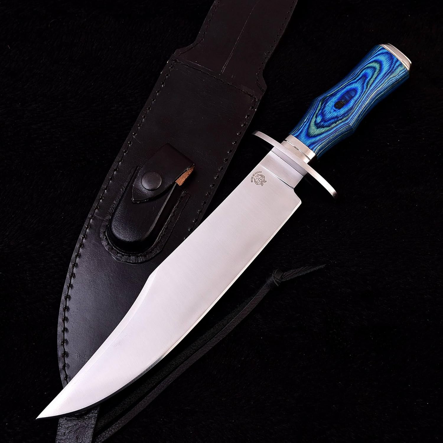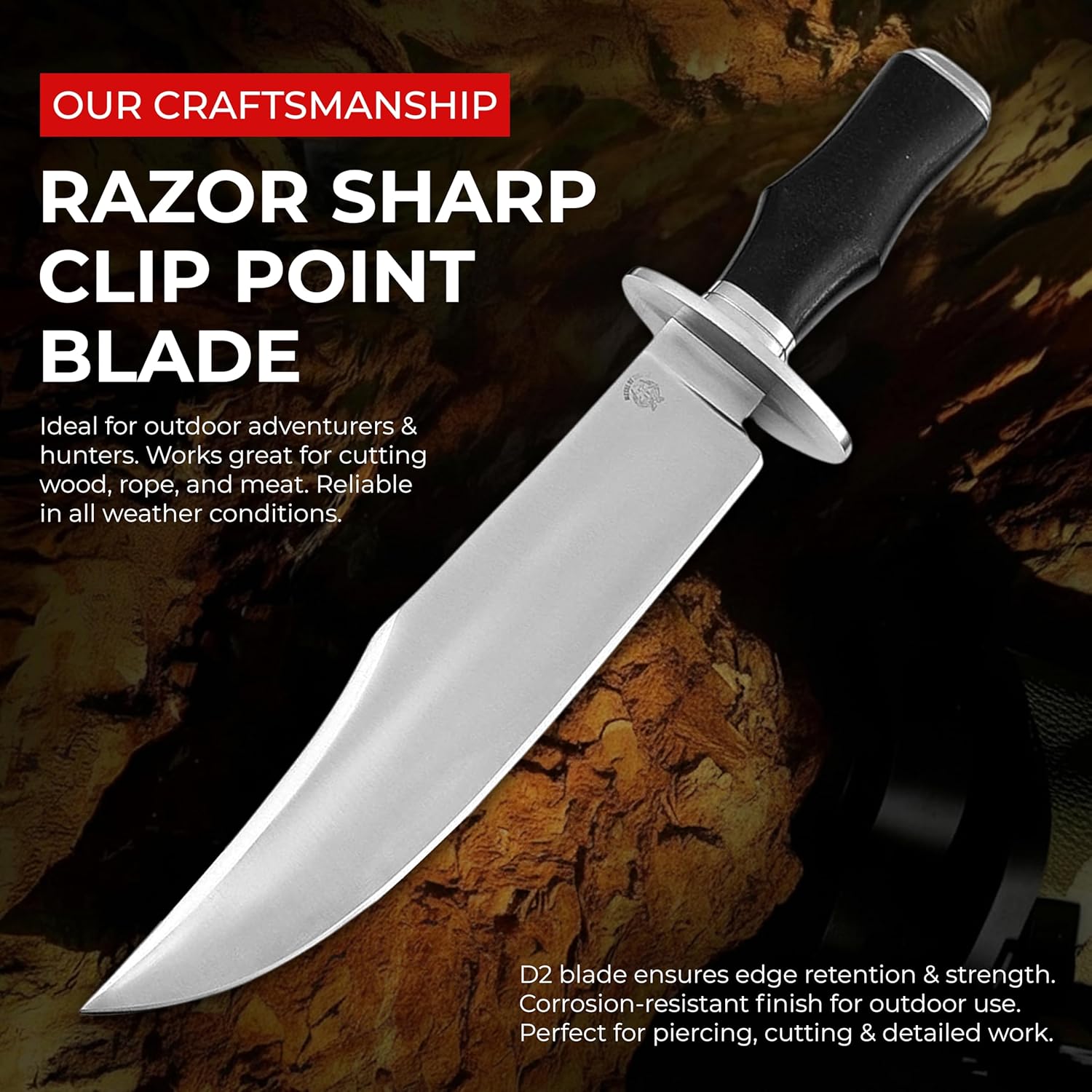 The D2 Bowie Knife features a razor-sharp 15-inch full tang blade built for survival and outdoor performance. Its strong D2 steel, comfortable wood handle, and durable leather sheath make it a reliable choice for hunting, camping, bushcraft, and a premium gift for men.