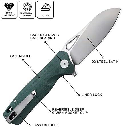The D2 Satin Blade Knife is a premium flipper folding knife designed for hunters, campers, bushcraft enthusiasts, and outdoor adventurers. Featuring a D2 steel blade with 60HRC hardness, it provides exceptional wear resistance and long-lasting sharpness. The Green G10 handle is moisture-resistant, anti-deformation, and ergonomically designed to offer comfort during extended use. Its satin finish enhances both appearance and corrosion resistance.