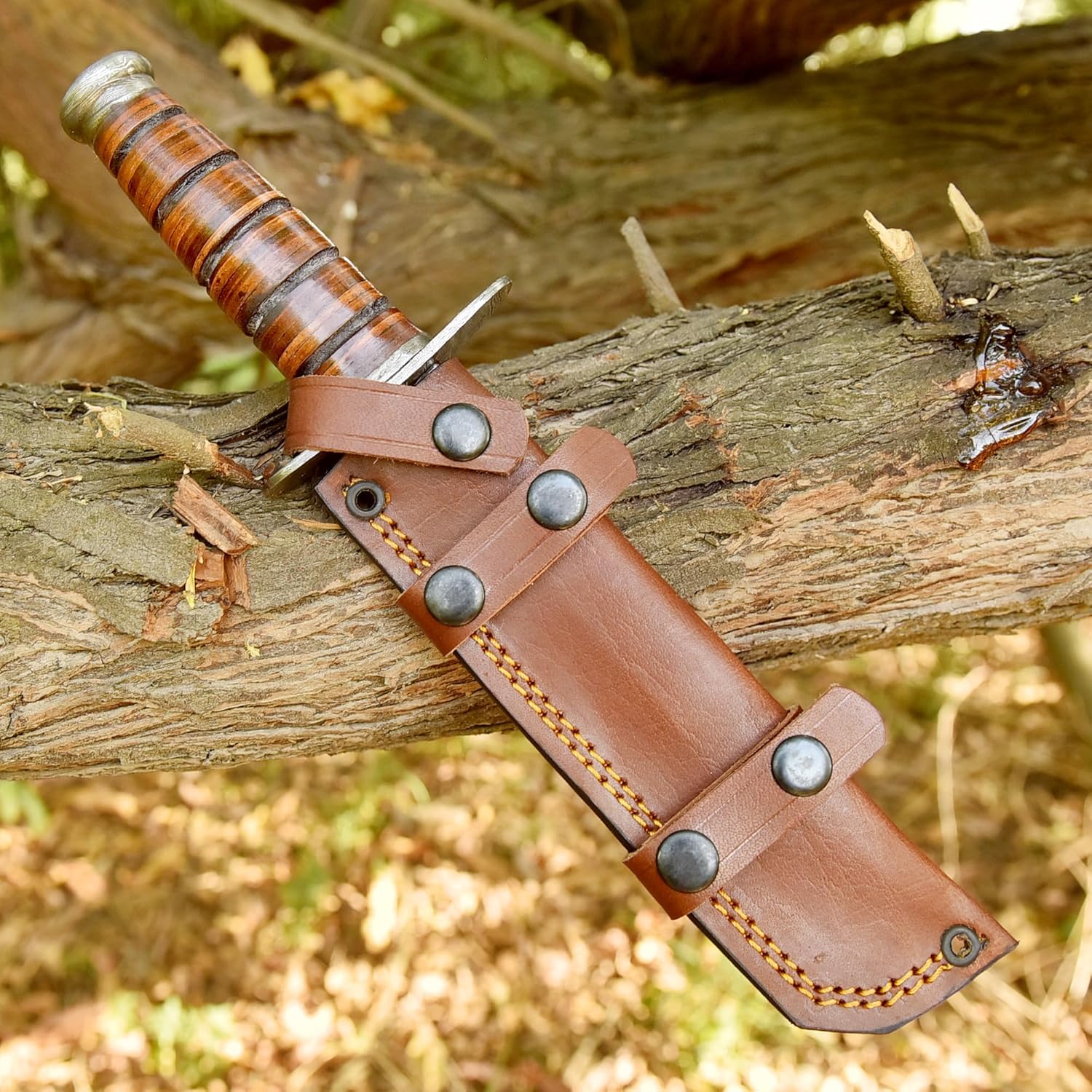 Clean the blade after each use and dry thoroughly. Apply a light coat of oil to maintain the steel and leather components. Store in a dry place and avoid prolonged moisture exposure to preserve performance and appearance.