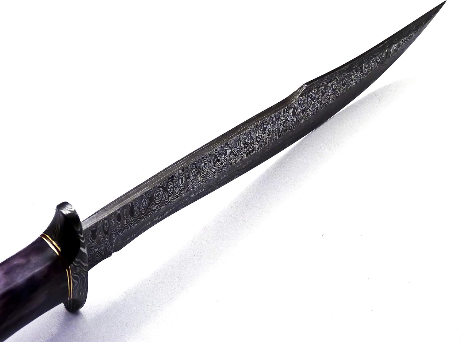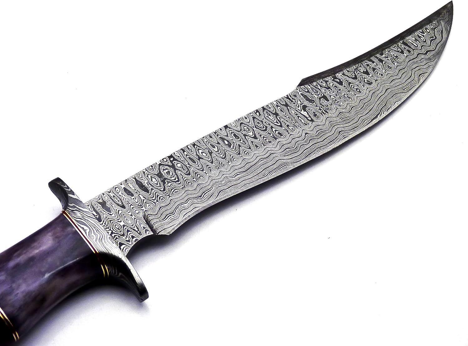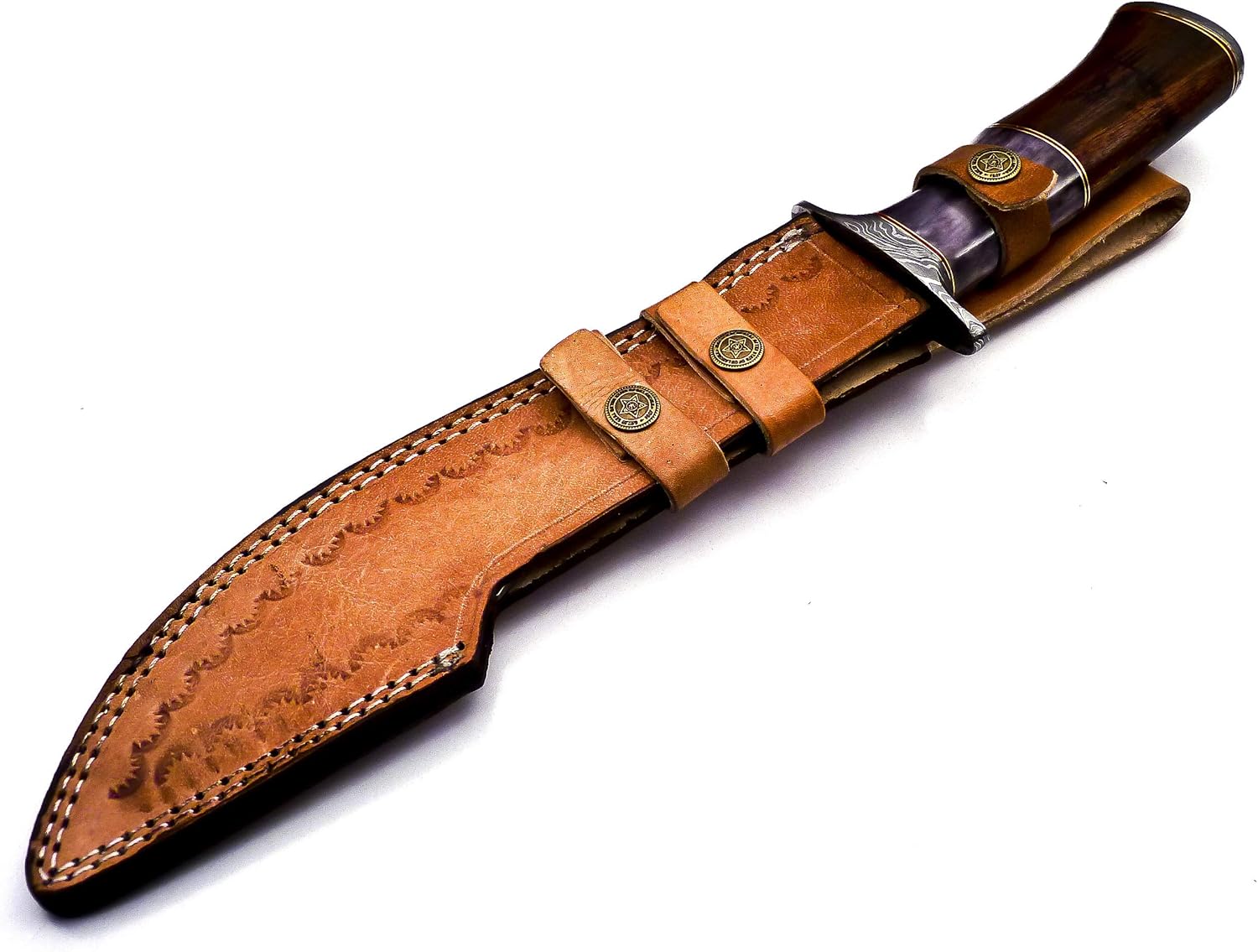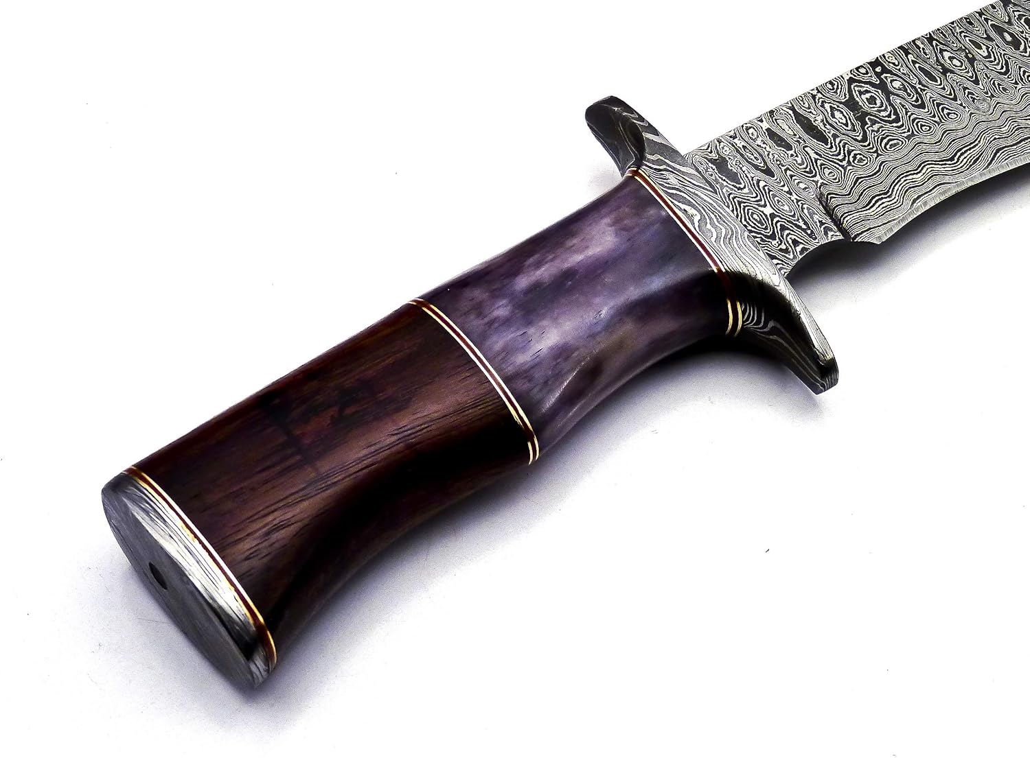 The Damascus Bowie Knife delivers excellent cutting performance, durability, and control. Its full tang build ensures reliability in tough outdoor tasks, while the ergonomic wood and horn handle provides a secure grip for extended use.