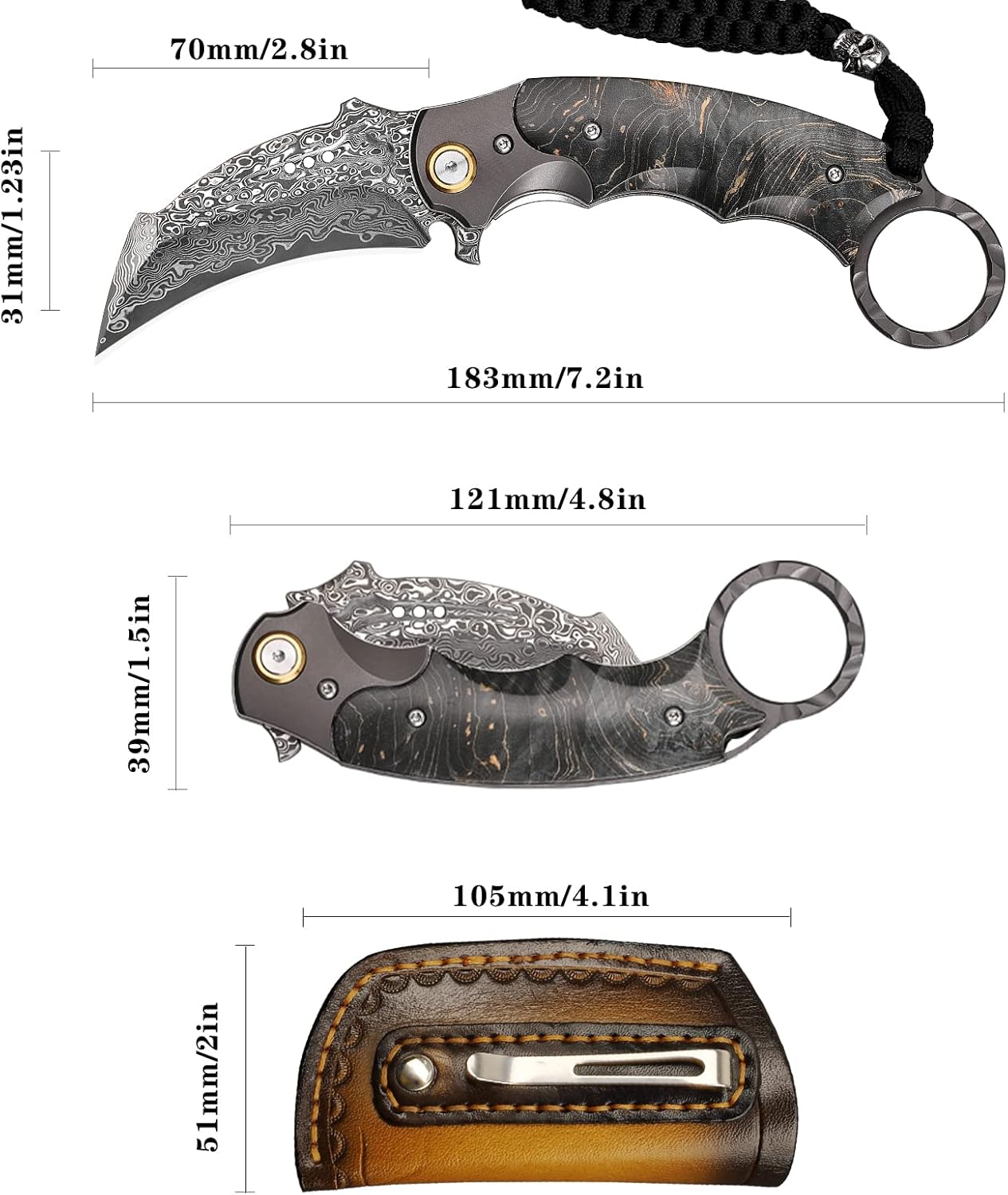Includes cowhide leather sheath and stainless steel pocket clip for easy carry