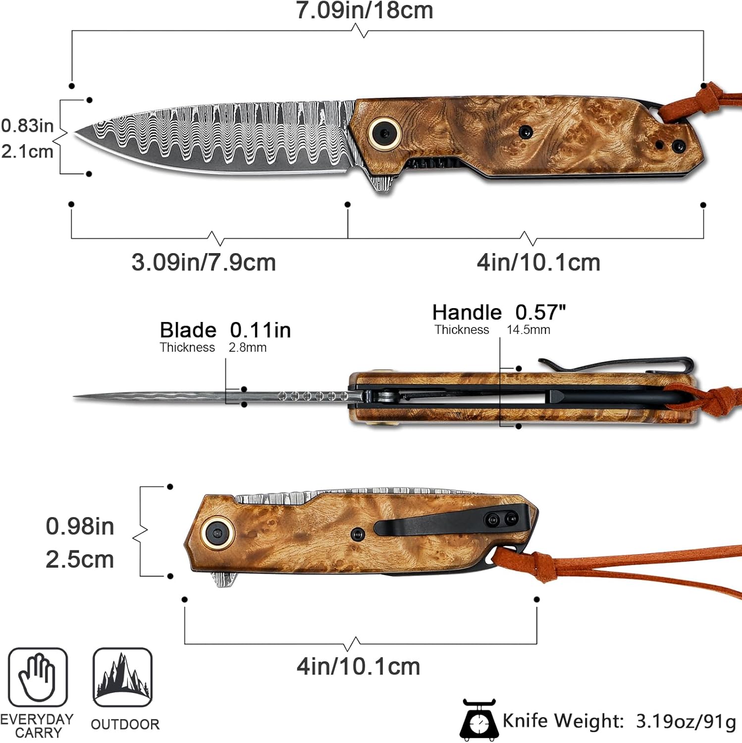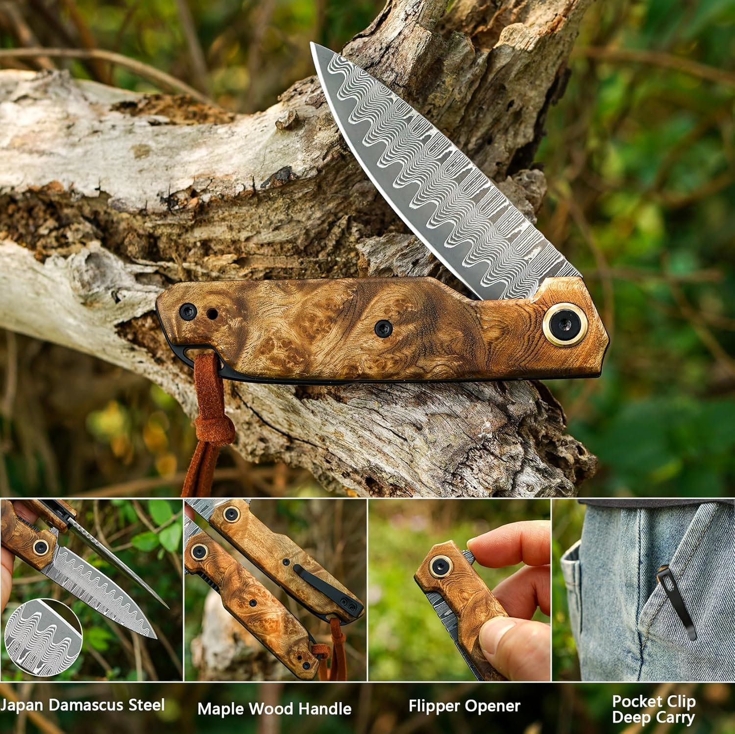 This Damascus Folding Pocket Knife features a sharp VG10 core blade and ergonomic maple wood handle. Lightweight and easy to carry, it is perfect for EDC, camping, and hiking. Designed for durability and comfort, it includes a pocket clip and cleaning cloth for added convenience.