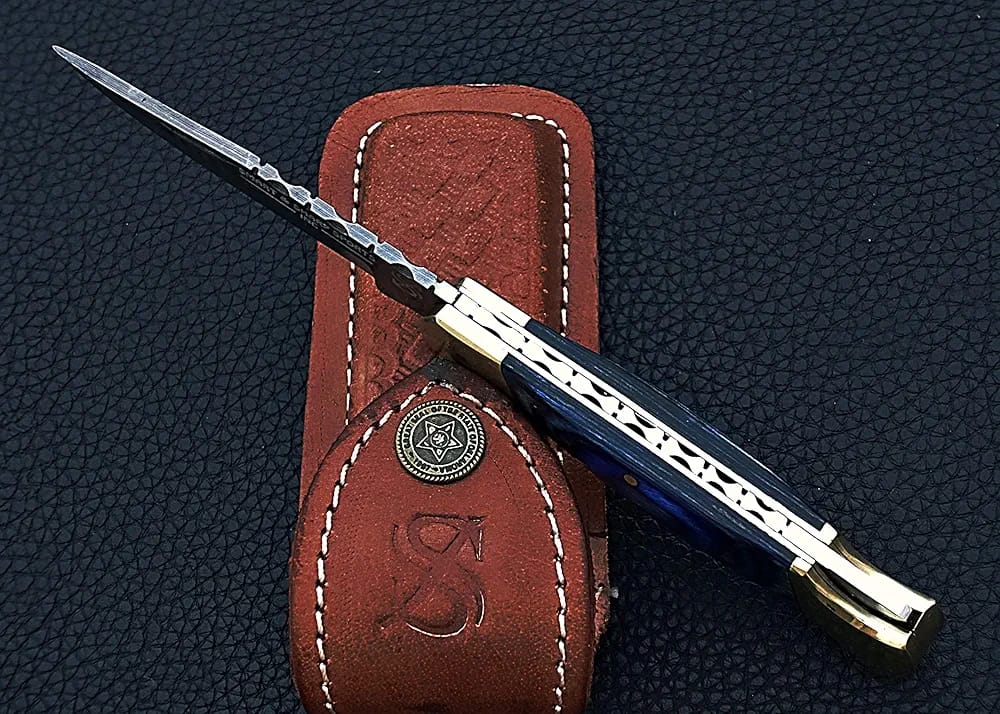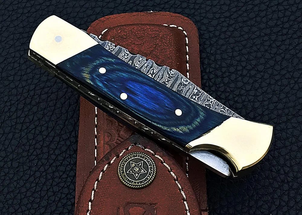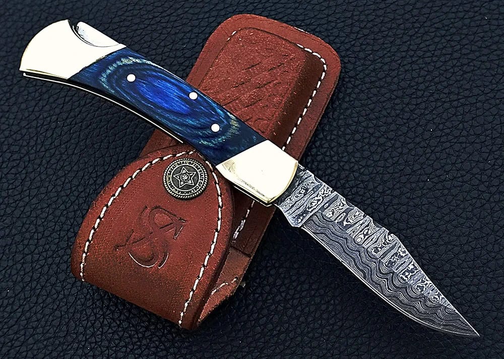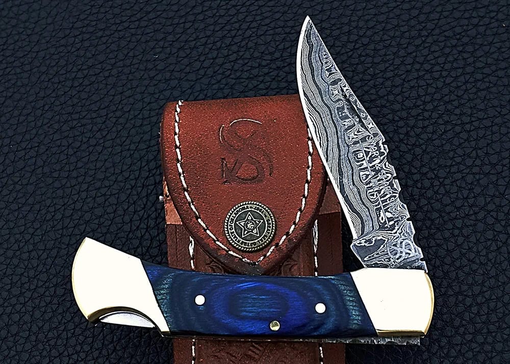 Damascus Folding Pocket Knife with Blue Wood Handle & Sheath mega blades