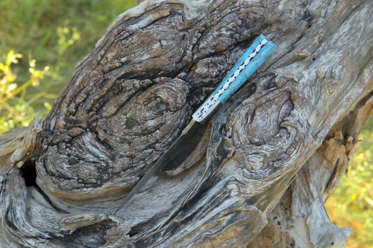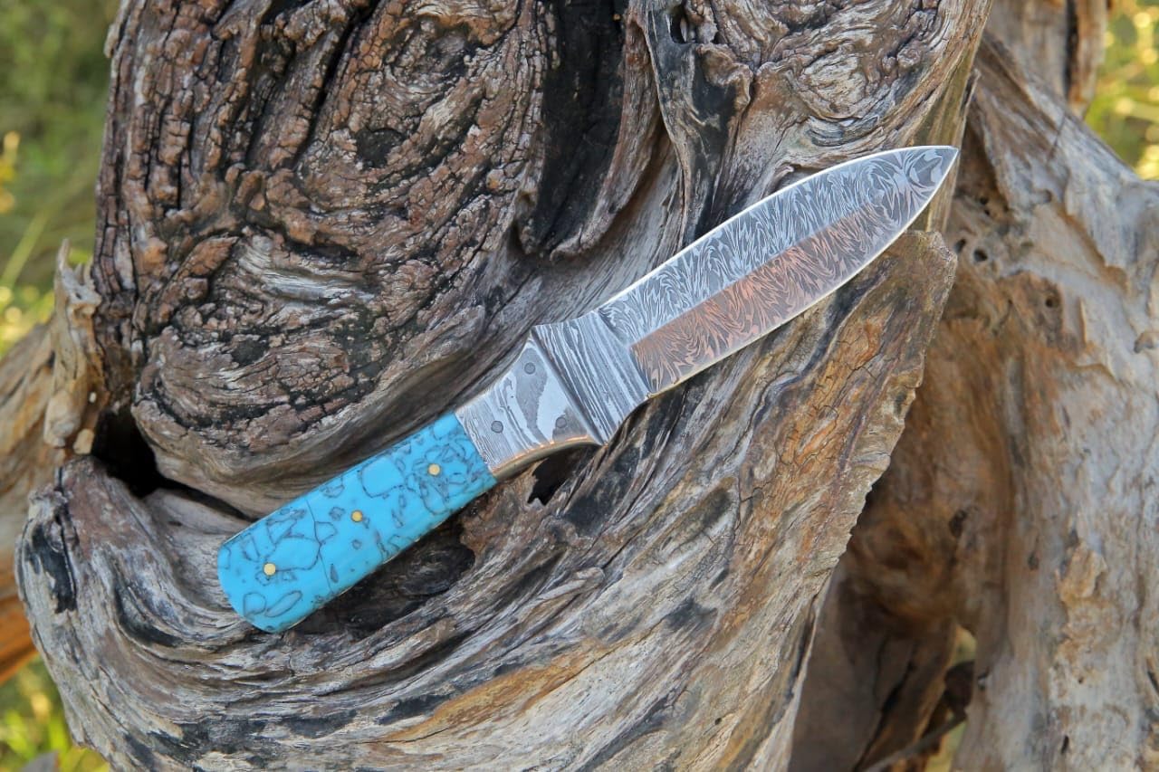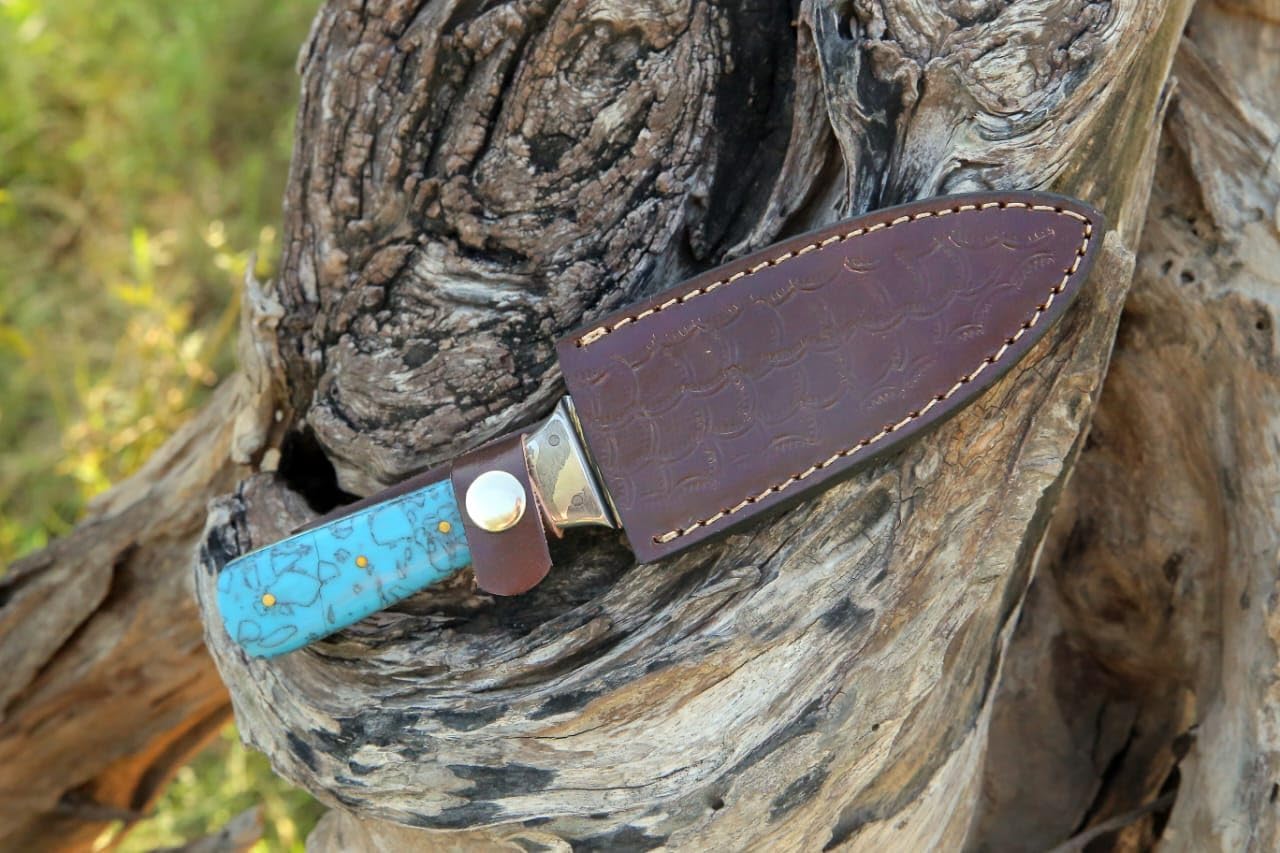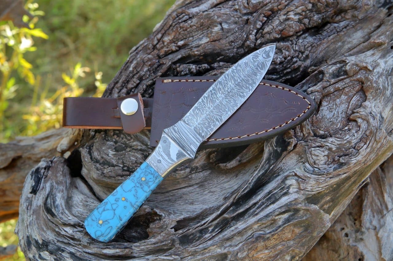Upgrade your outdoor adventures with the Damascus Hunting Knife, handcrafted with a razor-sharp 8.4-inch Damascus steel blade and a stunning turquoise-look resin handle. Perfect for hunting, camping, survival, and all outdoor tasks, this knife combines precision, durability, and aesthetic appeal.