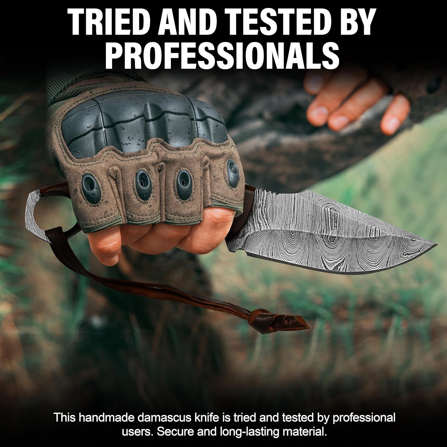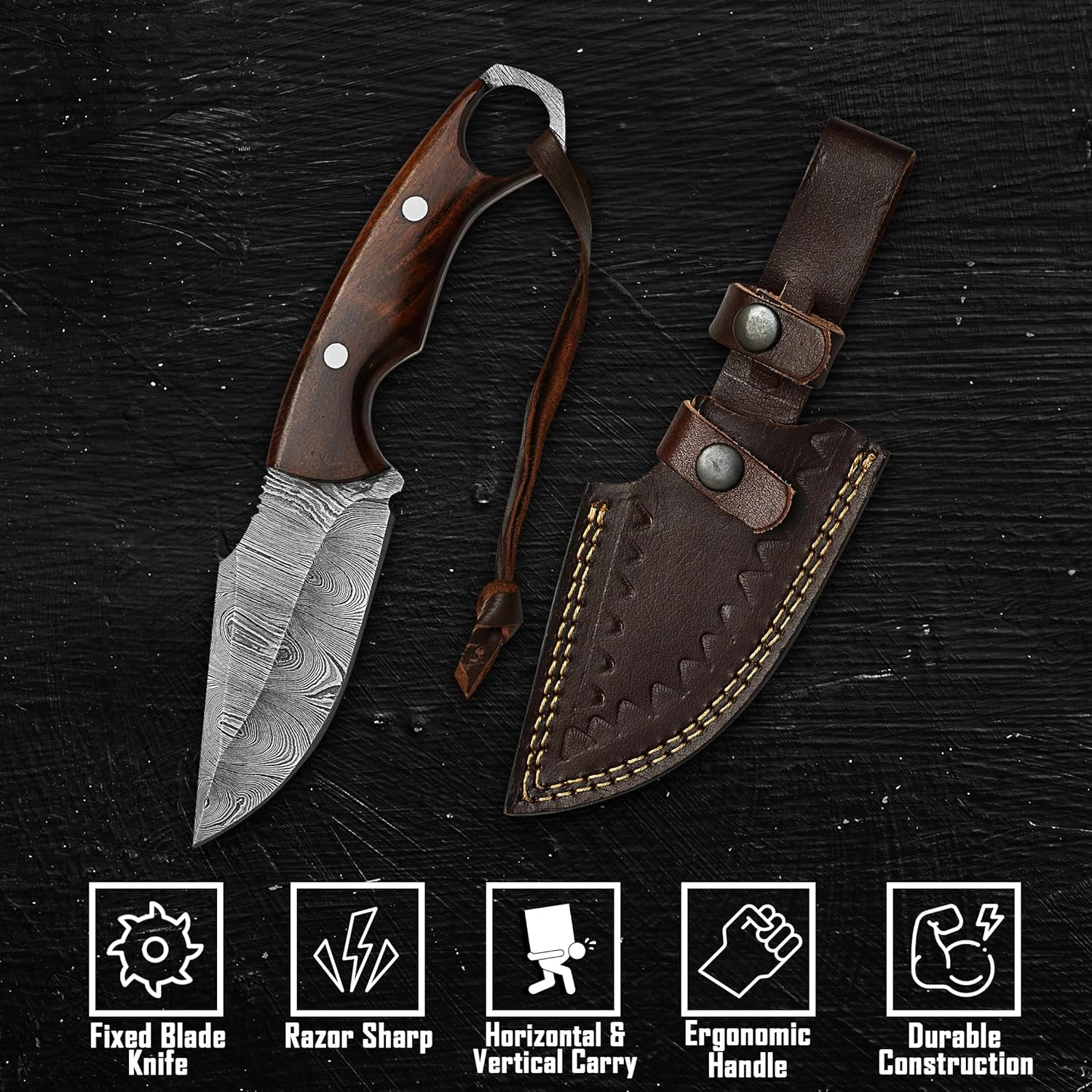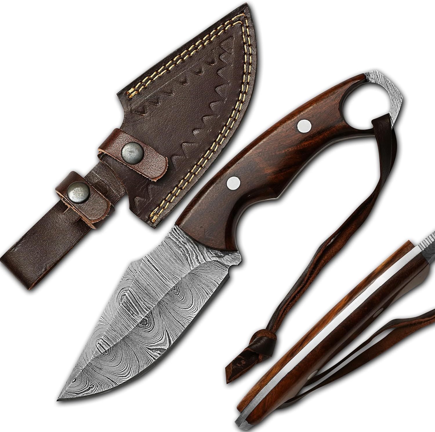 The Damascus Hunting Knife by BISONBROS is a premium handmade fixed blade crafted for hunters and outdoor enthusiasts. Forged from high-carbon Damascus steel with a stunning raindrop pattern, this knife delivers strength, sharpness, and balance. The rosewood handle and leather sheath complete this reliable bushcraft companion.