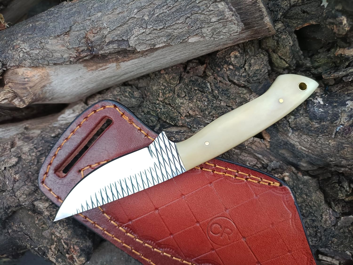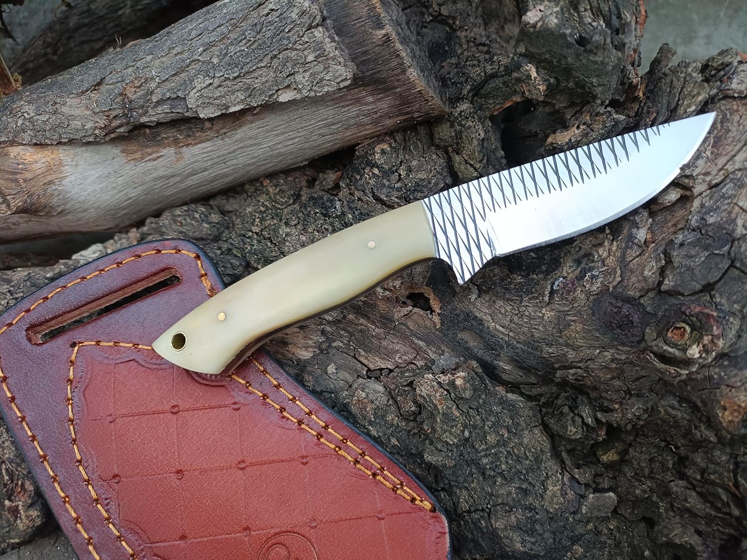 The KNIVES KING Handmade Fixed Blade Damascus Knife is crafted for hunters, campers, and outdoor enthusiasts. Featuring a Farrier Rasp steel blade with ultra-sharp edge and a sturdy bone handle, this full tang knife ensures durability, reliability, and precision. Its genuine leather sheath allows safe and convenient carry.