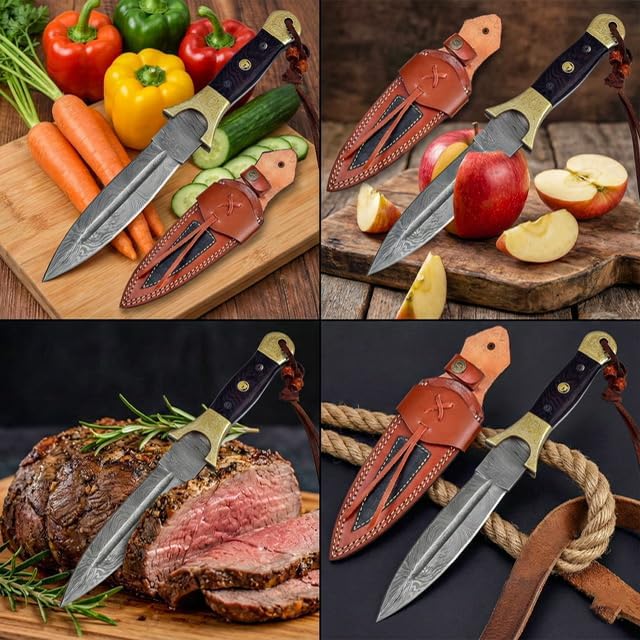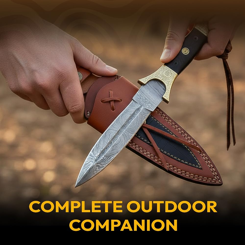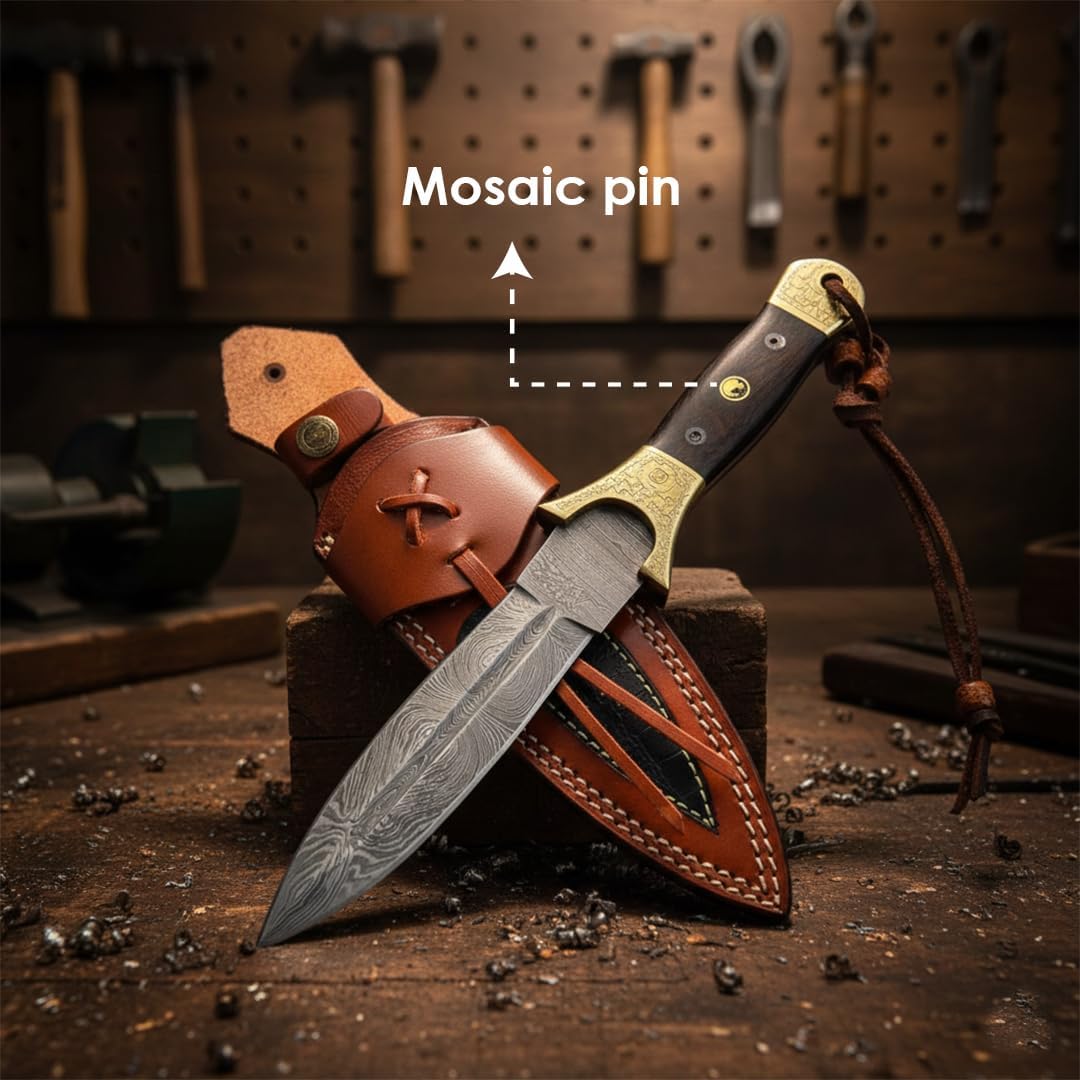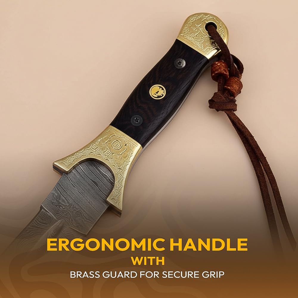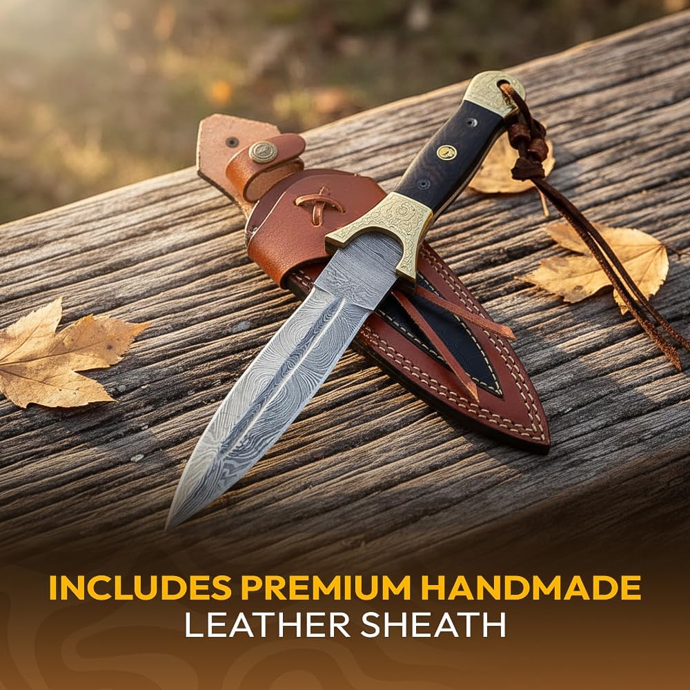 The Dessi Damascus Knife SM29 features a hand-forged 200-layer blade with 1095 high carbon steel and 15N20 steel, paired with a sturdy exotic wood handle and brass bolsters. Ideal for hunting, camping, and outdoor adventures, this full tang knife comes with a premium leather sheath for secure carry.