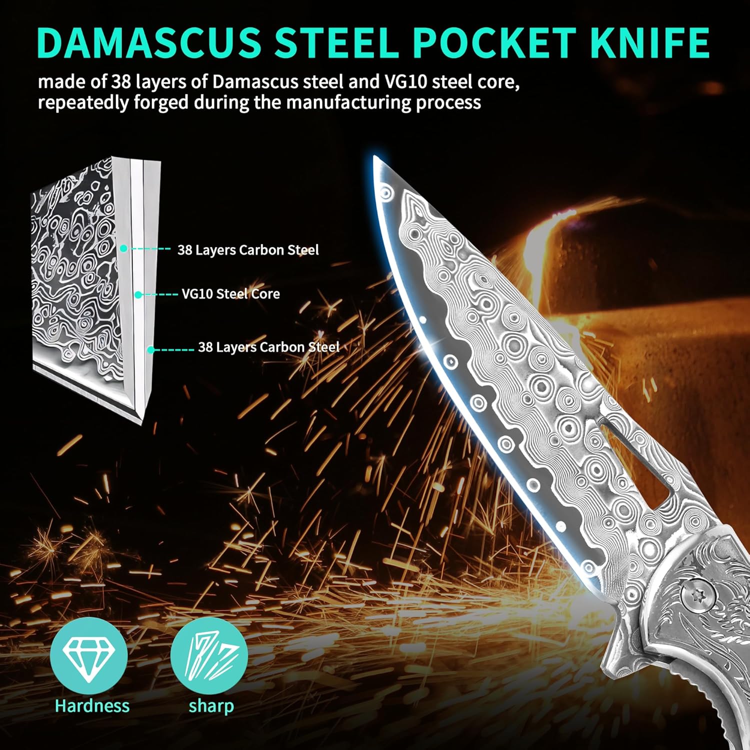 Damascus Pocket Knife – Handmade VG10 Folding Knife with Sheath mega blades