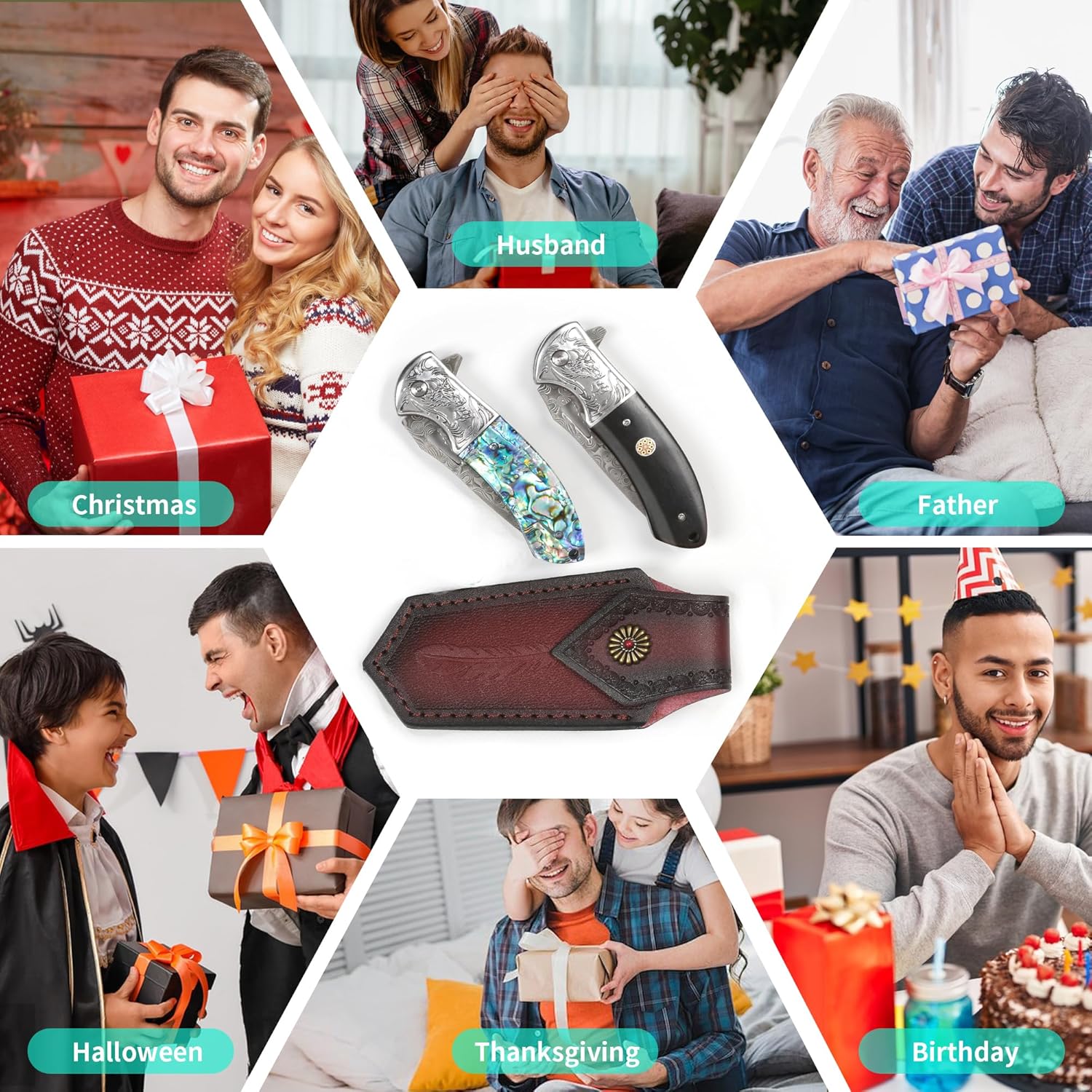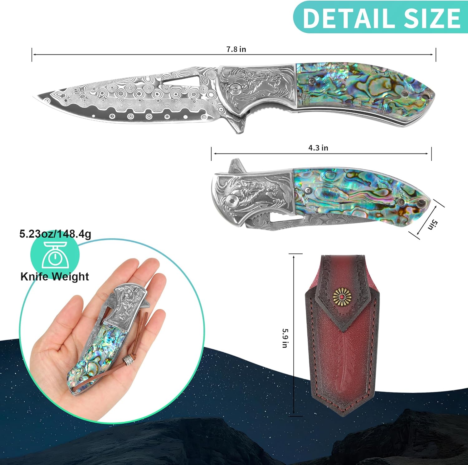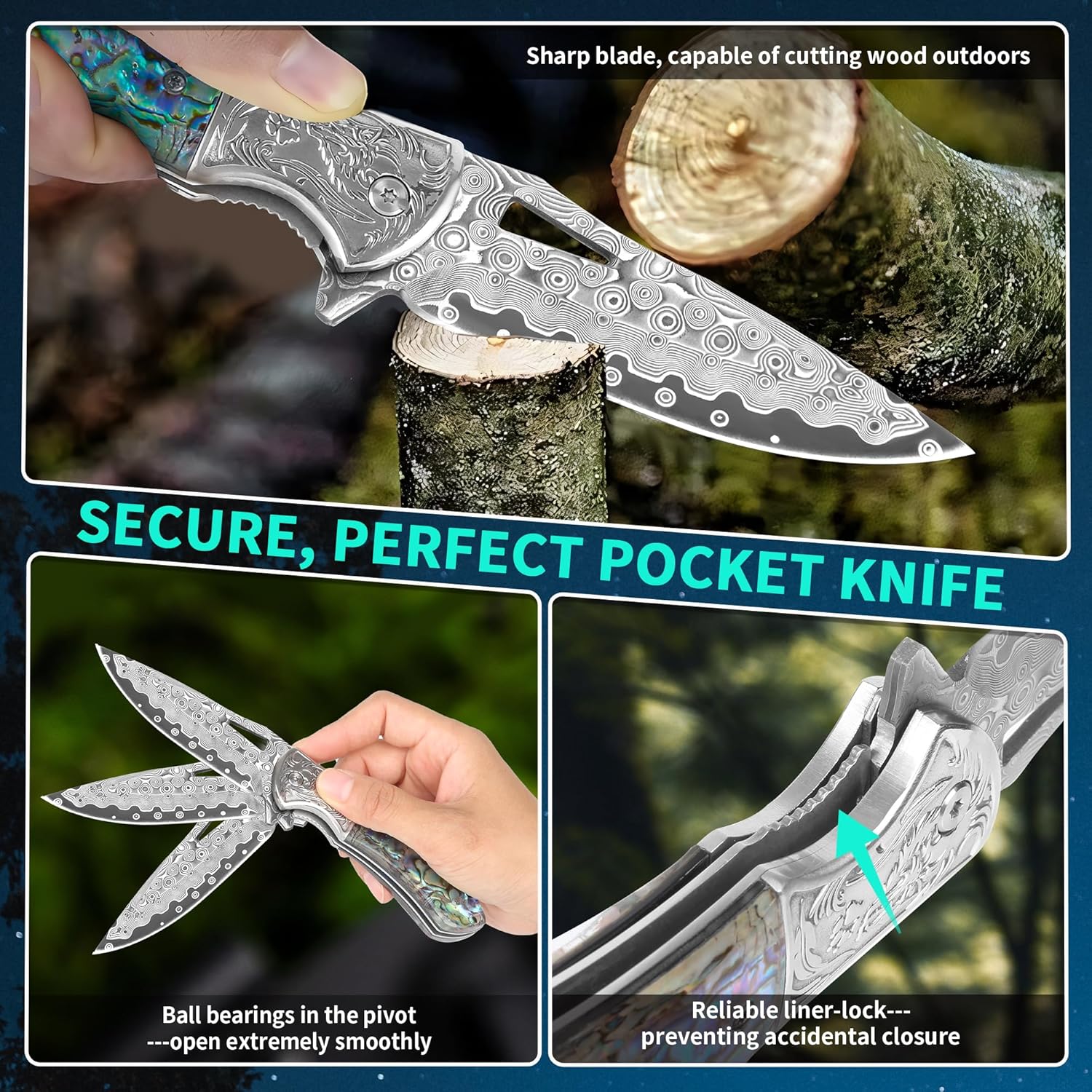 The Damascus Pocket Knife by KNOVATET is a beautifully handcrafted folding knife designed for everyday carry (EDC), outdoor adventures, and precision cutting. Its VG10 Damascus steel blade ensures exceptional sharpness and durability, while the ergonomic abalone shell handle provides a luxurious feel and secure grip.