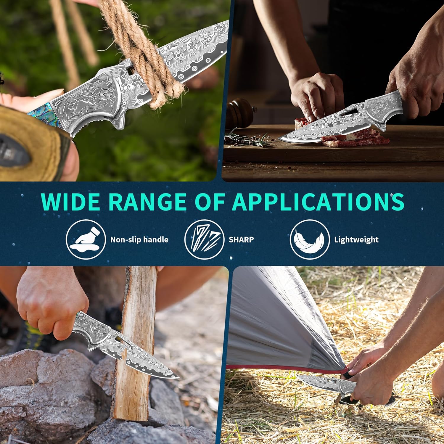 The Damascus Pocket Knife delivers precise and effortless cutting for indoor and outdoor tasks. Its lightweight folding design allows easy carrying in pockets or backpacks, while the durable VG10 blade ensures reliability in hiking, camping, fishing, and daily EDC tasks.
