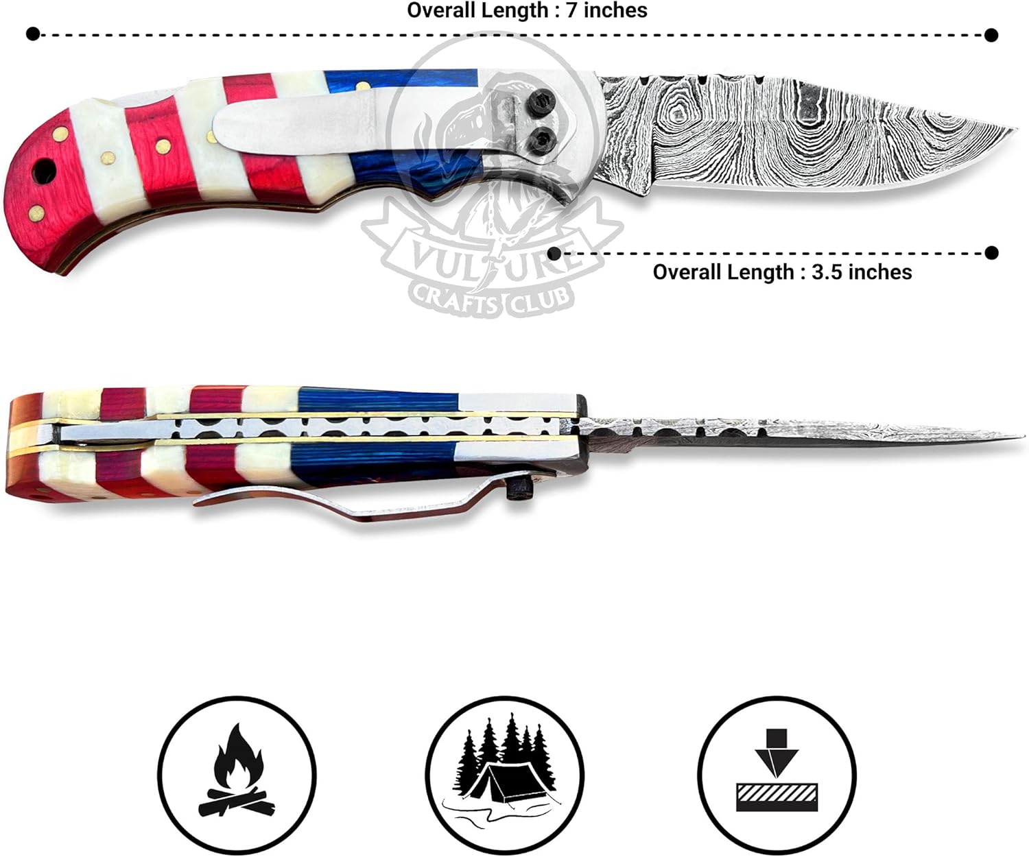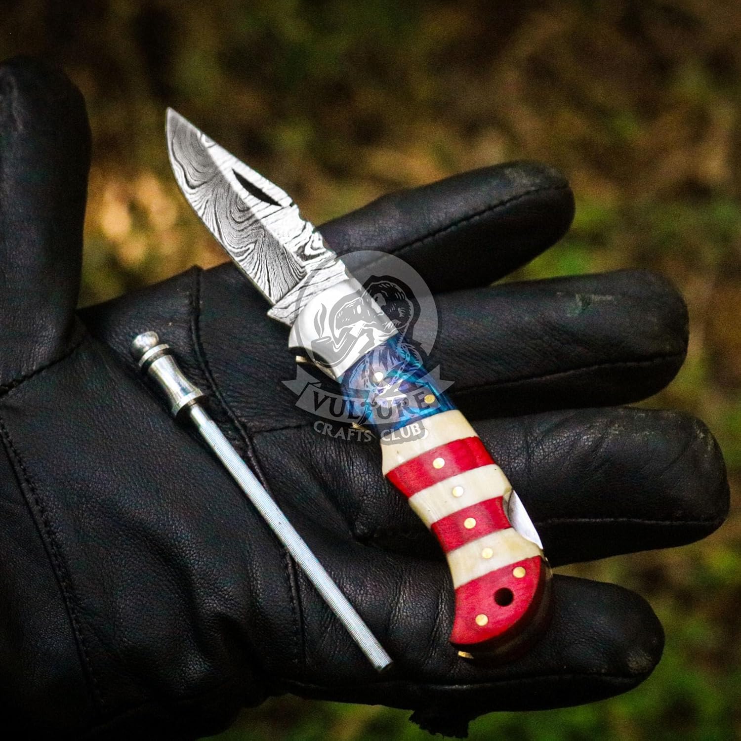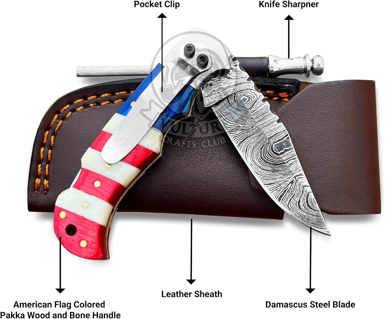 Damascus Pocket Knife with Leather Sheath – American Flag Handle mega blades