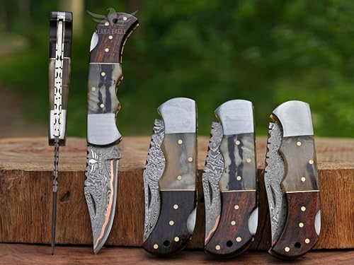 After each use, wipe the Damascus pocket knife blade clean and dry thoroughly. Apply a light coat of oil to preserve the steel and prevent corrosion. Store in the leather sheath when not in use to maintain handle and blade condition.