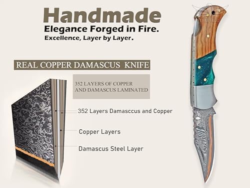 This Damascus pocket knife is a compact, high-performance folding knife designed for outdoor enthusiasts and collectors alike. Featuring a 3.5-inch Copper Damascus steel blade with intricate file work, it delivers exceptional sharpness, strength, and precision for camping, hiking, and survival tasks.