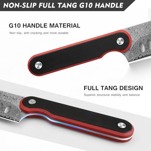 This Damascus steel Santoku knife stands out with its stunning layered raindrop pattern, high-hardness steel core, and premium dual-color G10 handle. Every knife is visually unique while delivering consistent performance, making it both a functional tool and a statement piece.