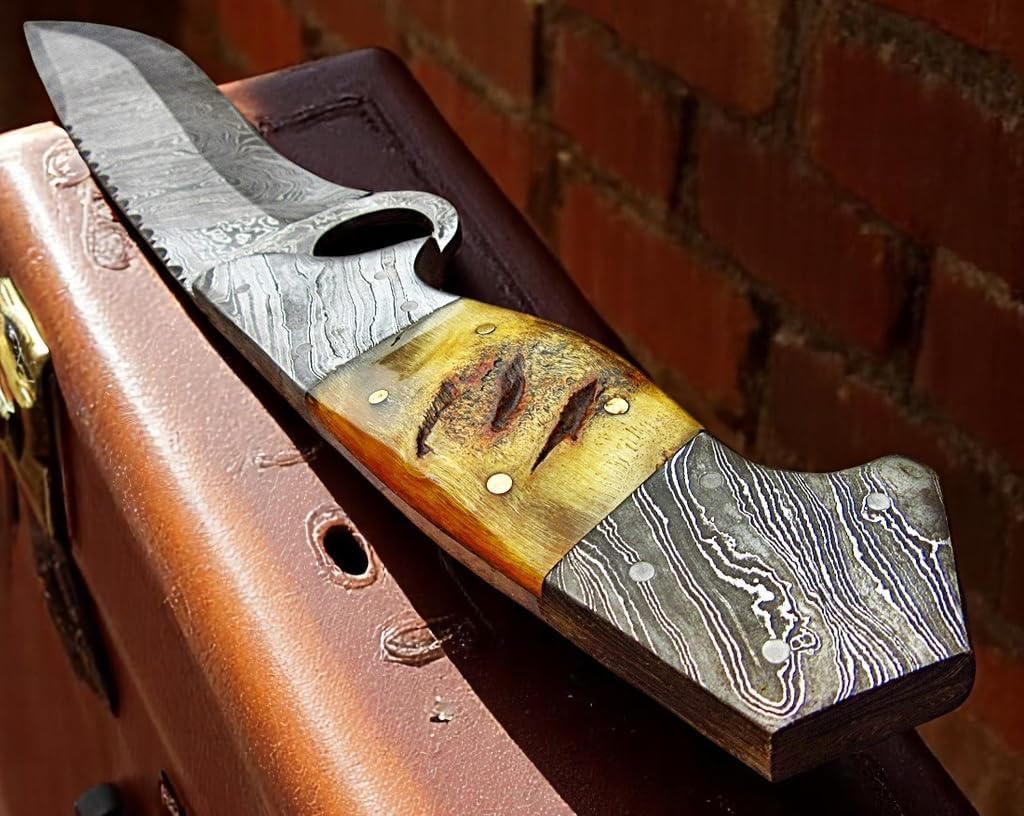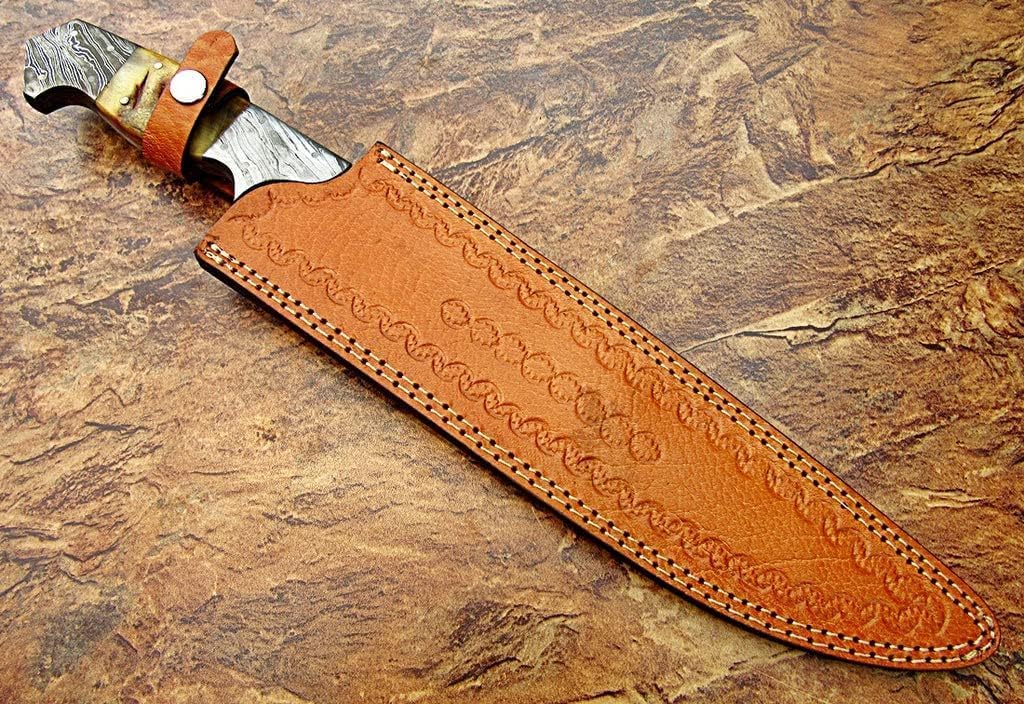 This Handmade Damascus Steel Bowie Knife is crafted for hunters, collectors, and knife enthusiasts who value strength, beauty, and longevity ⚔️. Featuring a razor-sharp blade with a stunning twist pattern and a luxurious lamb horn handle with Damascus steel bolsters, this knife is designed to perform—and to last forever.