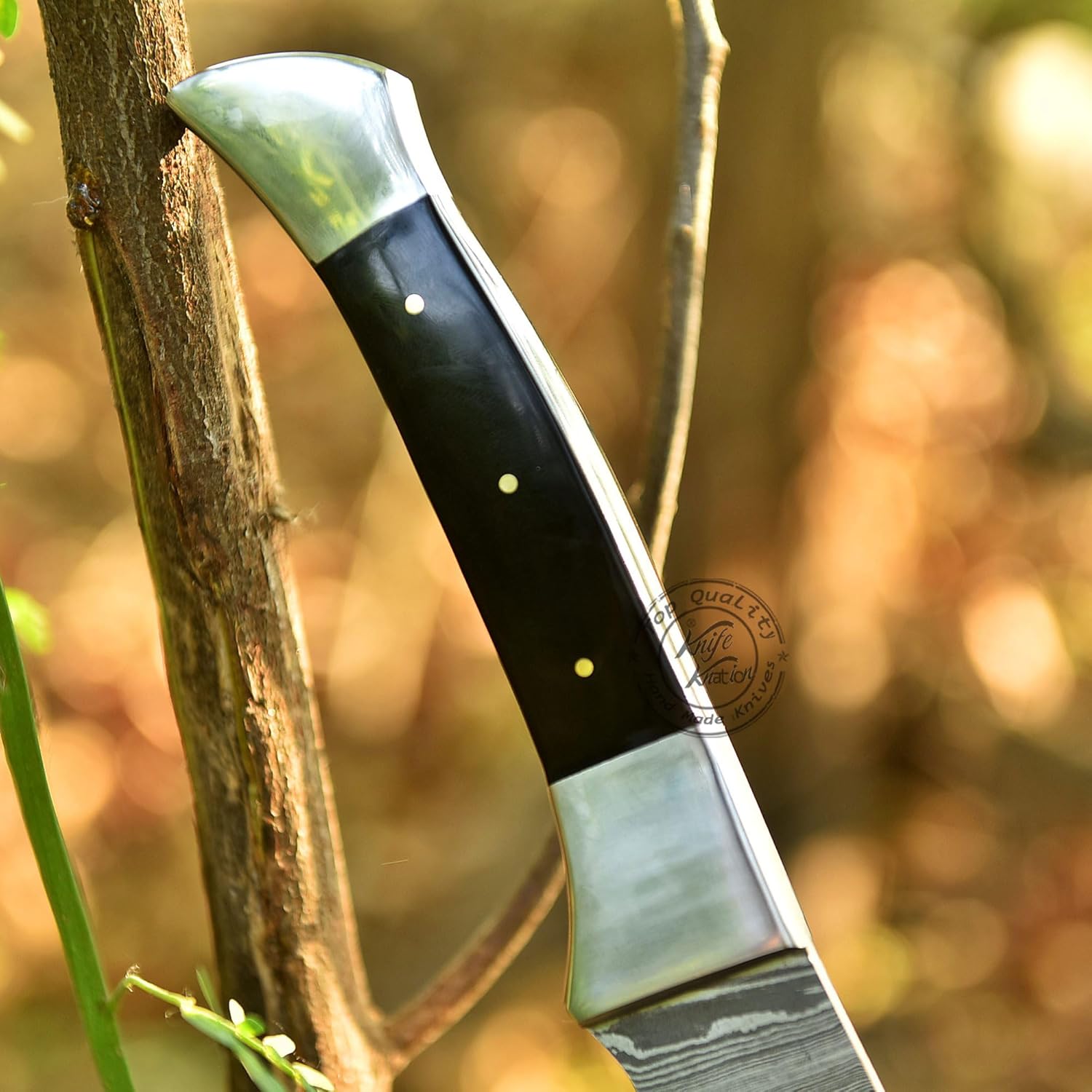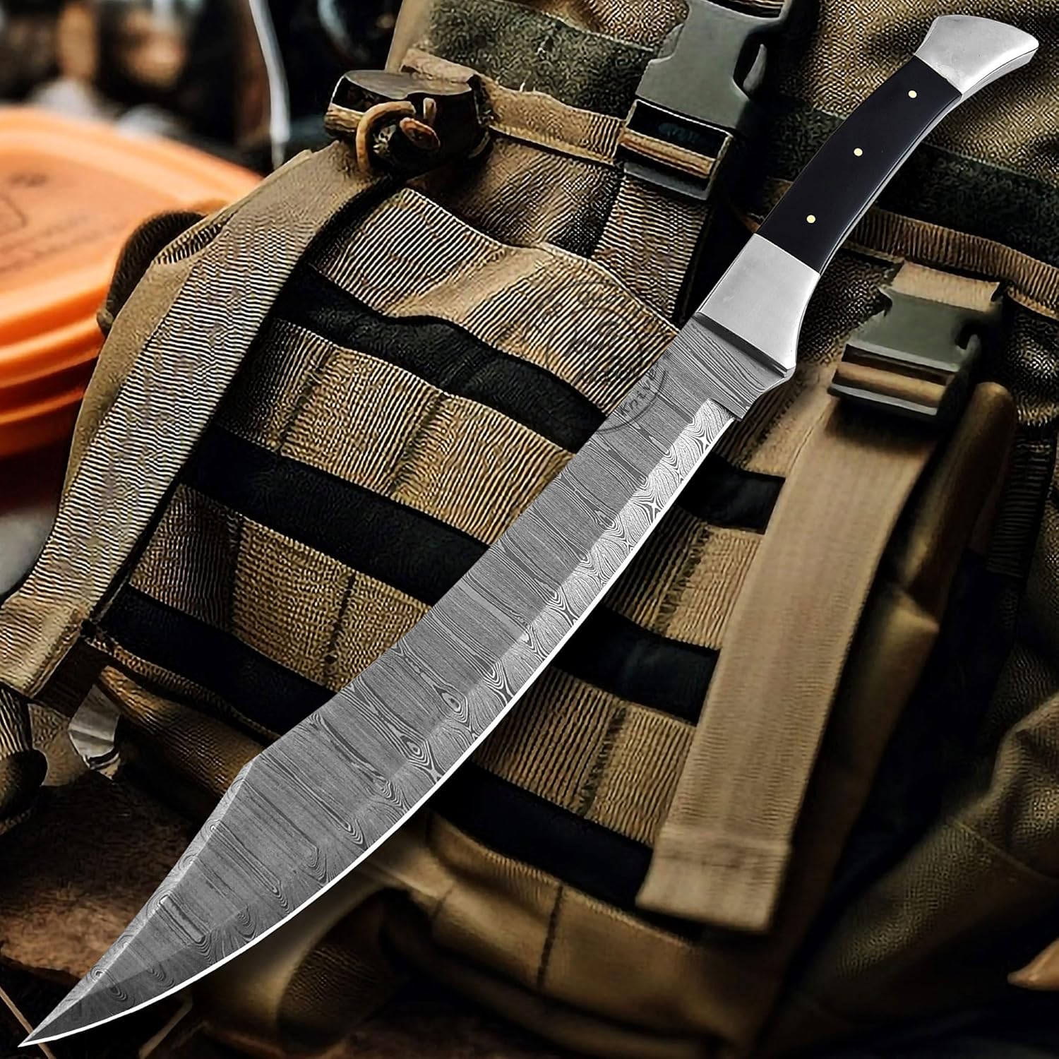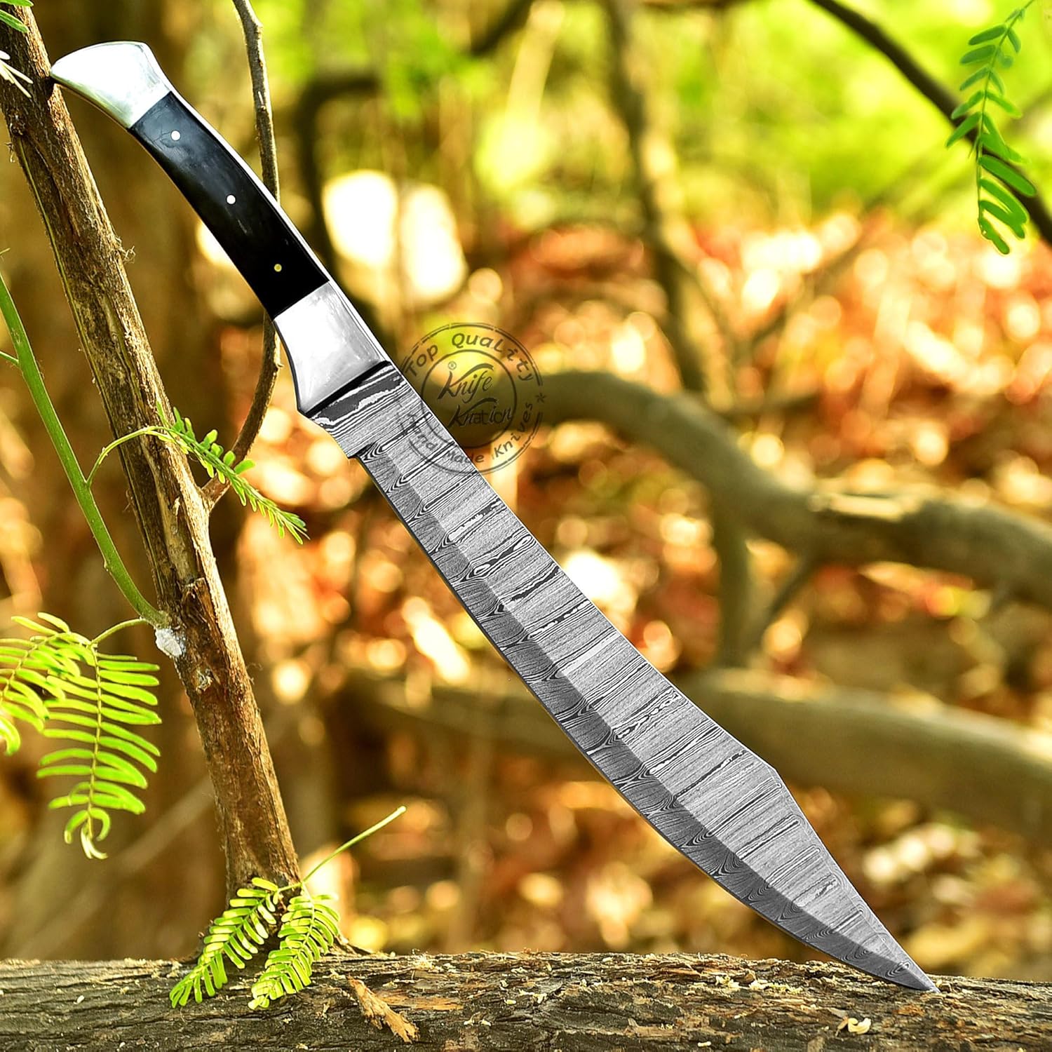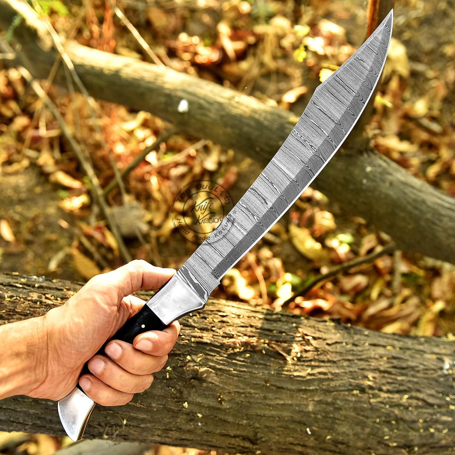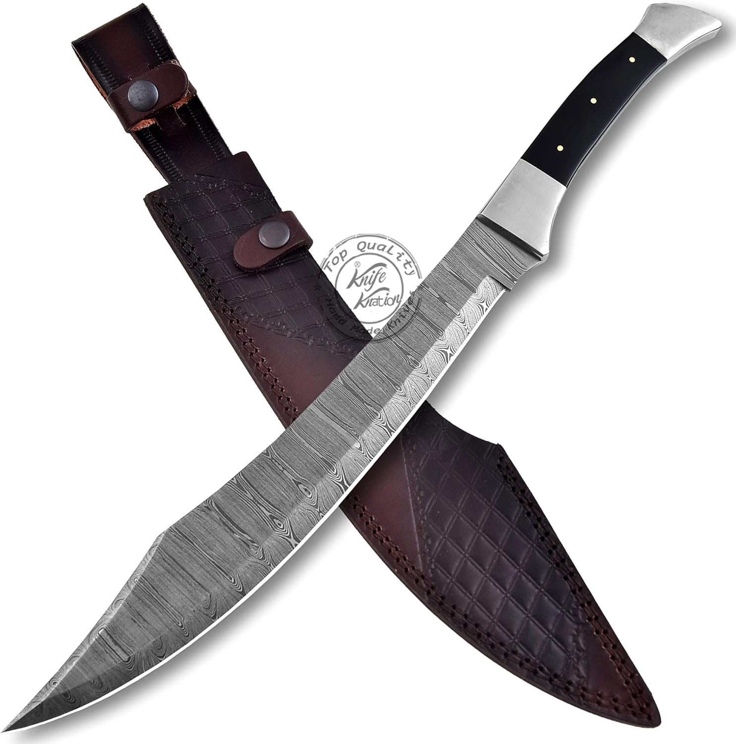 The Damascus Steel Short Sword by Knife Knation is a handcrafted Bowie knife designed for hunters, campers, bushcraft enthusiasts, and EDC users. With an 18-inch overall length, 12-inch razor-sharp Damascus steel blade, and black sheet handle with steel bolsters, this knife combines style, precision, and durability.