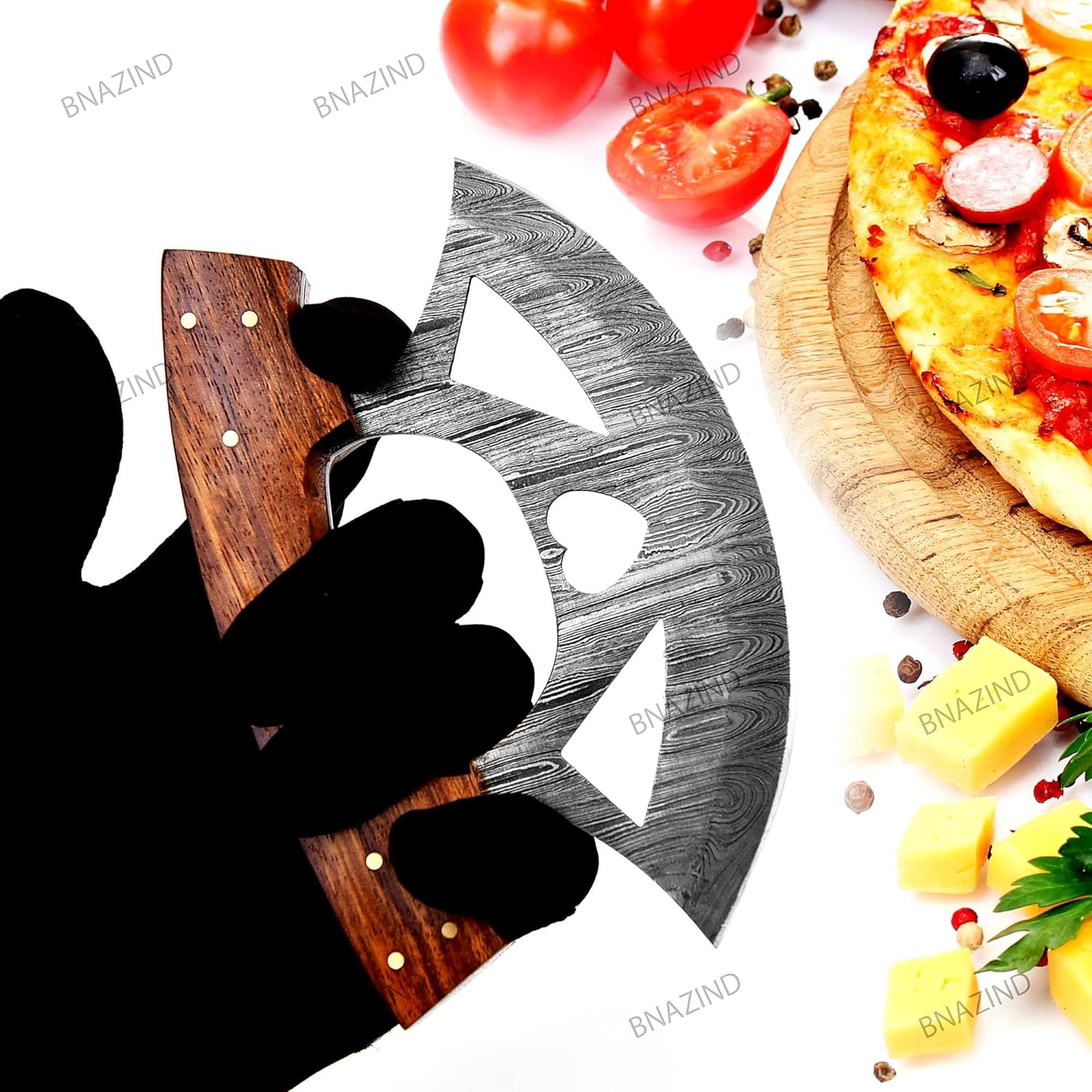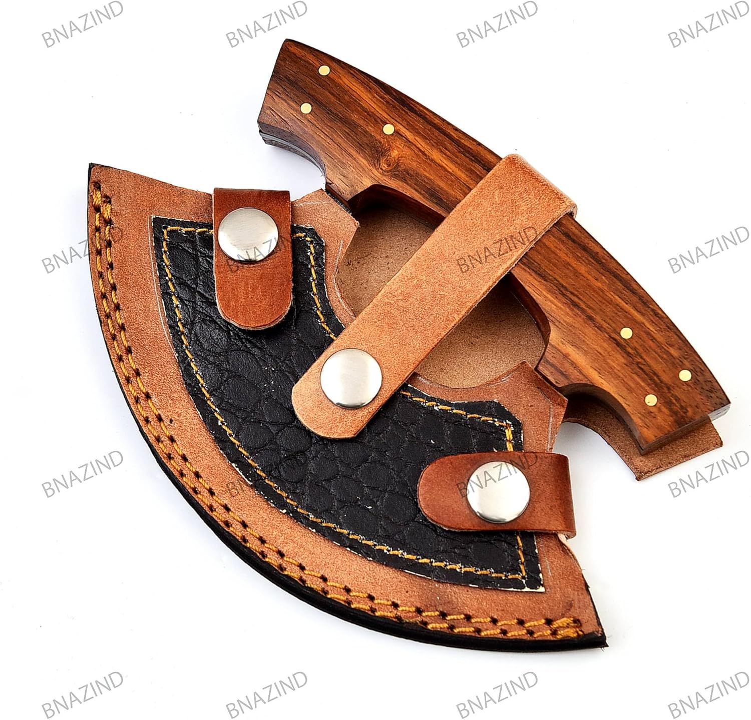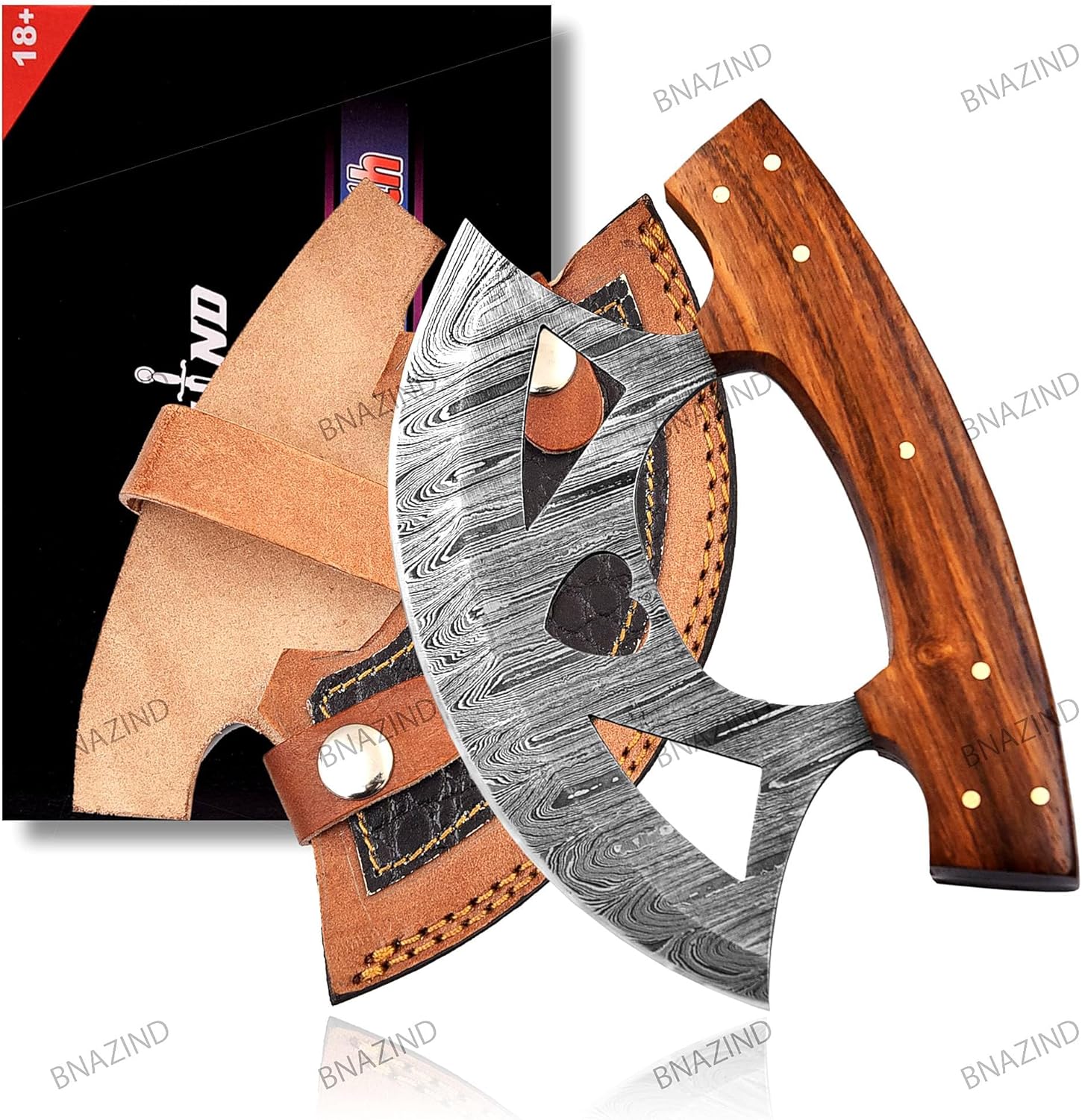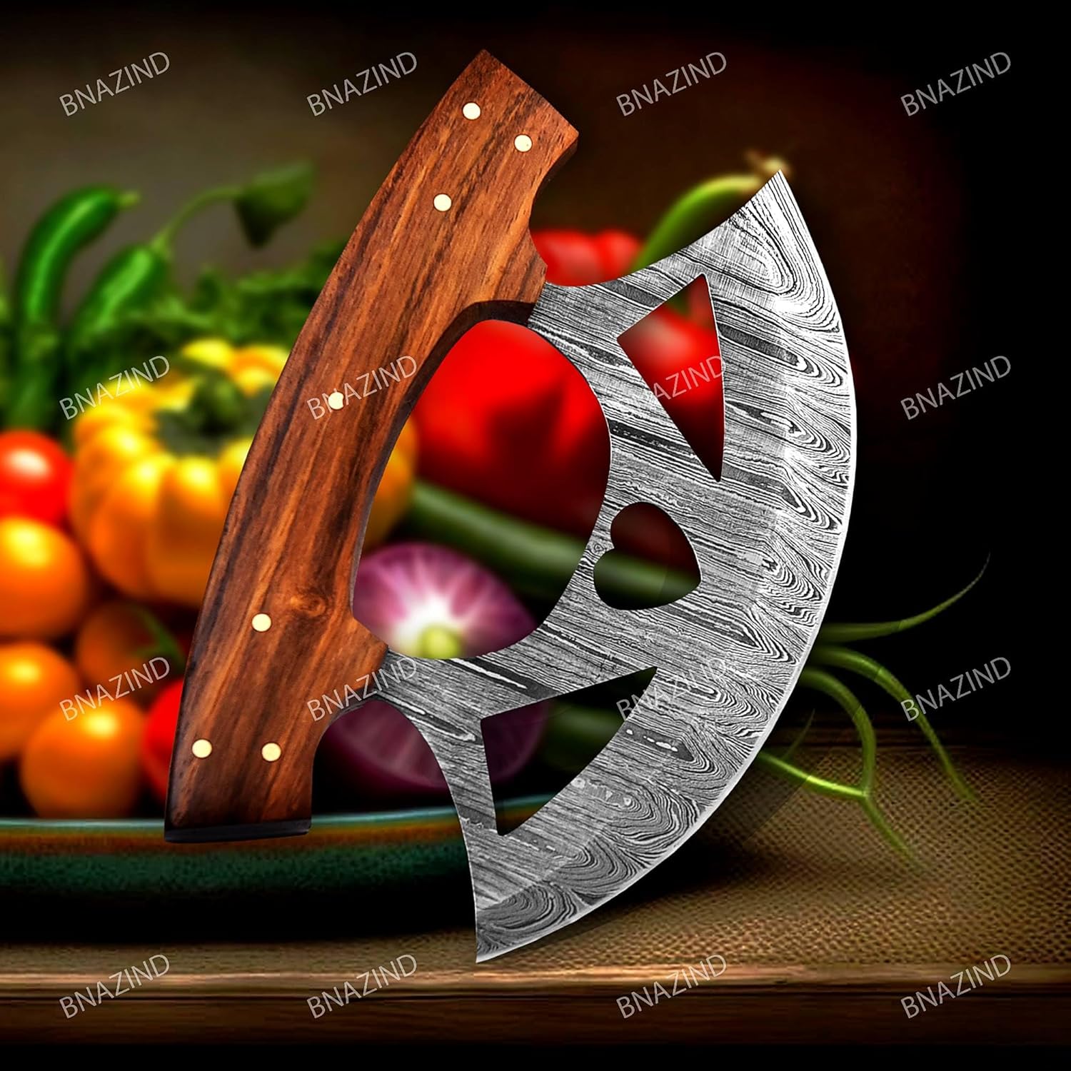 The Damascus Ulu Knife features a 5.75-inch curved Damascus steel blade and ergonomic rosewood handle for precise chopping, slicing, and dicing. Lightweight, versatile, and sheath-included, this handmade Mezzaluna knife is ideal for kitchen tasks, pizza cutting, or outdoor cooking, making it the perfect gift for chefs.