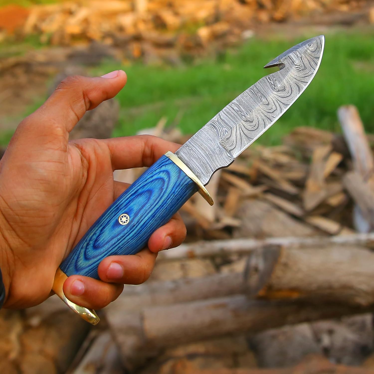 π Elegant blue Pakka wood handle paired with a brass guard