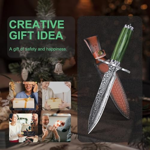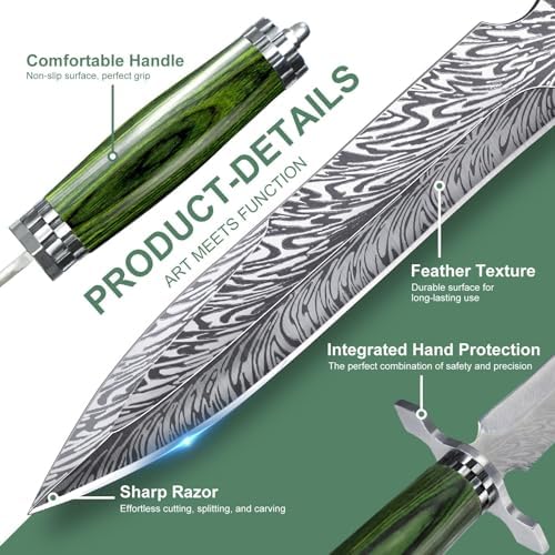 The Fixed Blade Knife is a premium outdoor tool combining precision, durability, and style. Made from D2 high-strength steel, it offers excellent edge retention and corrosion resistance. The Damascus feather pattern adds both aesthetic appeal and functional sharpness. With a green Pakkawood handle and a full tang design, this knife is perfect for camping, hunting, survival, and bushcraft activities.