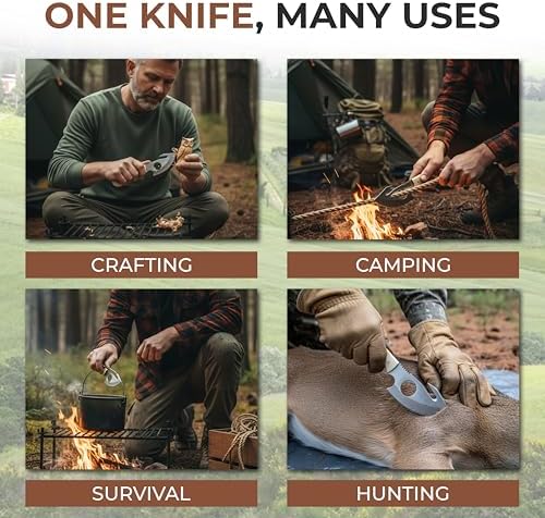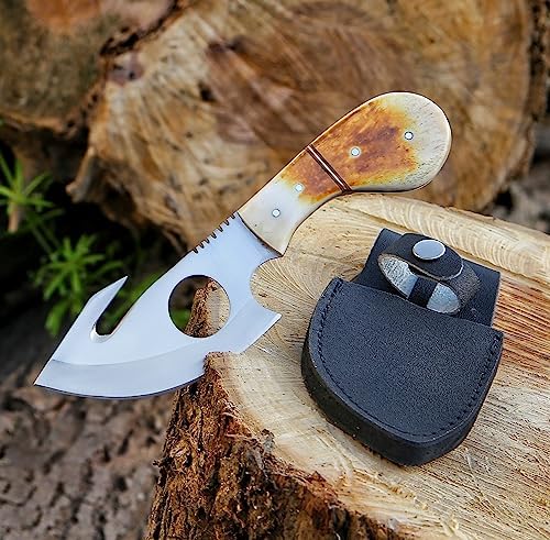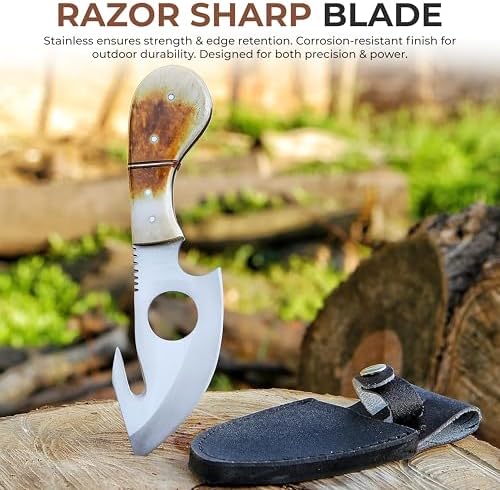 This outdoor gut-hook knife combines precision and versatility, making field dressing, camping, and survival tasks easier. Its lightweight design and ergonomic bone handle ensure comfort during extended use, while the gut hook allows for clean, efficient skinning of game.
