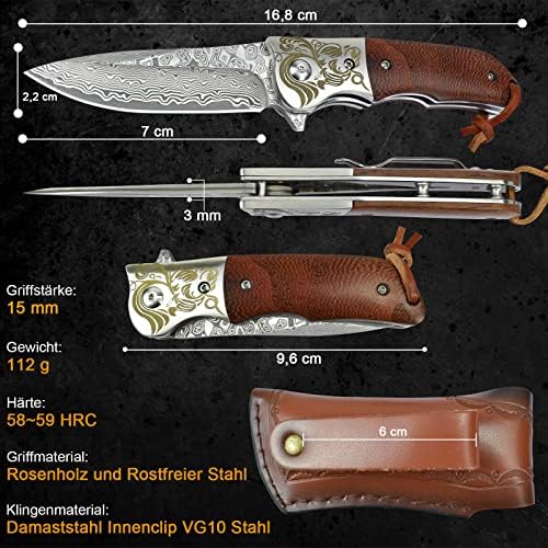 Experience the perfect blend of craftsmanship and functionality with this Damascus Pocket Knife. Designed for outdoor enthusiasts, hunters, campers, and collectors, this knife features a premium VG10 steel blade and a comfortable rosewood handle. Its folding design, portable clip, and ergonomic grip make it an essential tool for survival, outdoor adventures, and everyday carry.