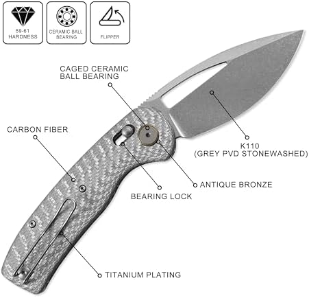 This Folding Knife features a premium 3.5-inch K110 steel blade with a durable stonewashed finish and a carbon fiber handle, built for campers, EDC enthusiasts, and outdoor adventurers. With its precise cutting ability and compact design, this knife excels in camping, survival, and everyday carry tasks.
