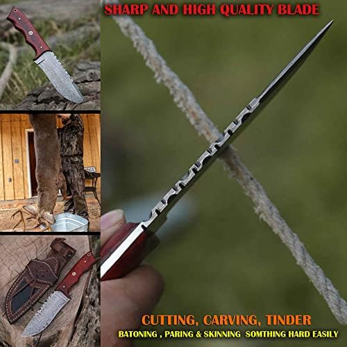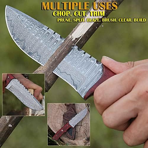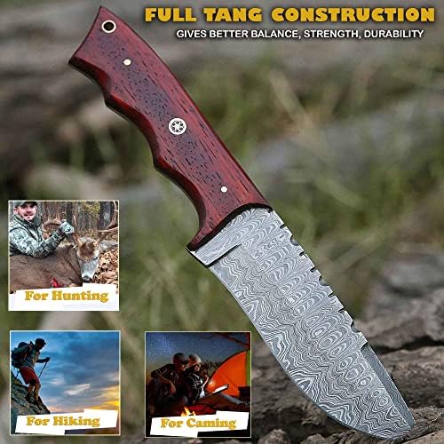 The Damascus Hunting Knife is a meticulously handcrafted 10-inch fixed blade knife designed for hunters, campers, hikers, and survival enthusiasts. Featuring a 4.9-inch Damascus steel blade forged from 288 layers, this knife provides unmatched edge retention, strength, and aesthetic appeal. The ergonomic red Padauk wood handle ensures comfortable handling, making it a reliable partner for all outdoor adventures.
