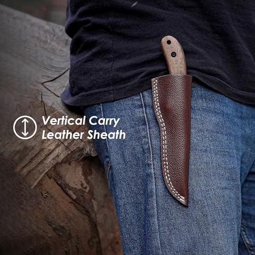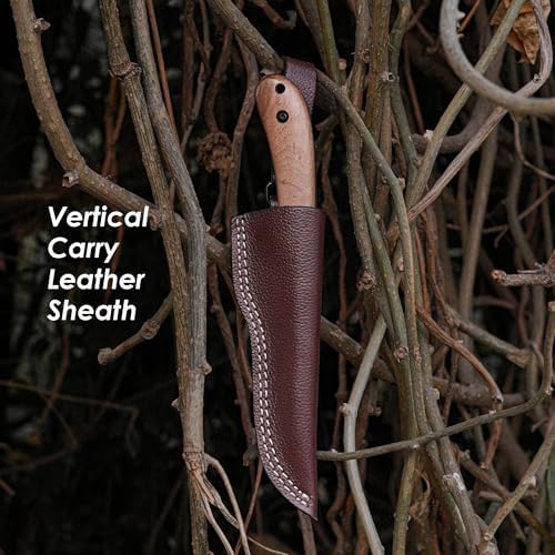 The outdoor knife features a razor-sharp scandi grind blade, premium walnut handle, and robust leather sheath. Perfect as a gift or personal gear, it delivers craftsmanship, aesthetic appeal, and practical utility for camping, hunting, or tactical missions.