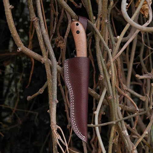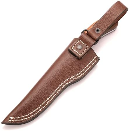 Clean the blade after use with a soft cloth and dry thoroughly. Apply light oil to prevent rust. Store the knife in its leather sheath when not in use, and avoid prolonged exposure to moisture to maintain blade sharpness and handle integrity.