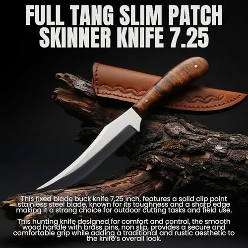 The Full Tang Slim Patch Skinner Knife is a premium fixed blade knife designed for hunters, campers, and outdoor enthusiasts. Featuring a 7.25-inch stainless steel clip point blade, a rustic burlwood handle, and a protective leather sheath, this knife combines precision cutting performance with comfort and durability for fieldwork and outdoor adventures.