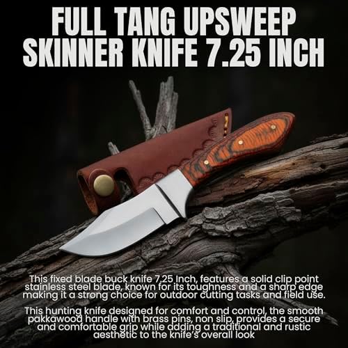 Feature Specification Blade Material Stainless Steel Blade Type Clip Point, Full Tang Overall Length 7.25 inches Handle Material Pakkawood with Brass Pins Sheath Leather, top-grain Blade Function Skinning, hunting, camping, cutting Weight Lightweight & balanced Use Outdoor adventures, hunting, bushcraft, EDC Benefits