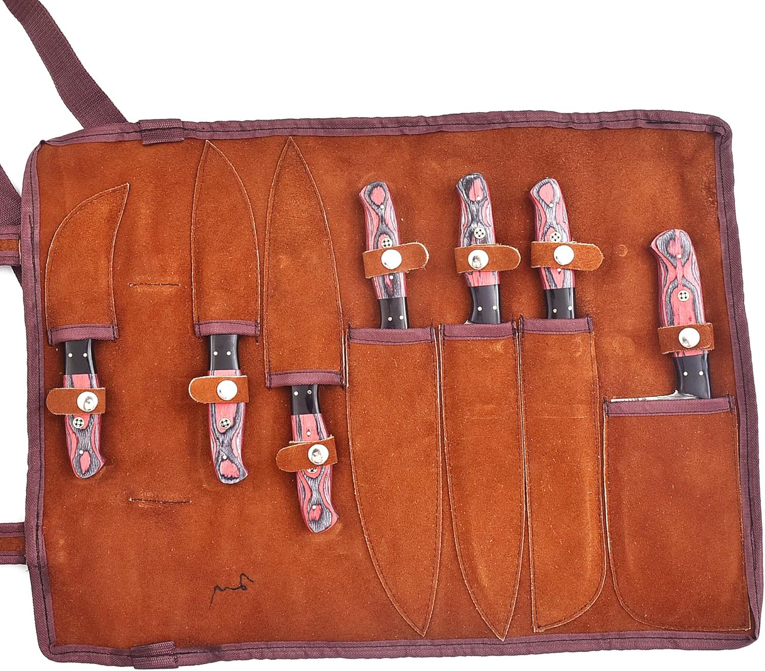 7-piece set includes 8″ Chef Knife, 8″ Bread Knife, 6″ Boning Knife, 5″ Utility Knife, 3.5″ Paring Knife, and Leather Roll Bag