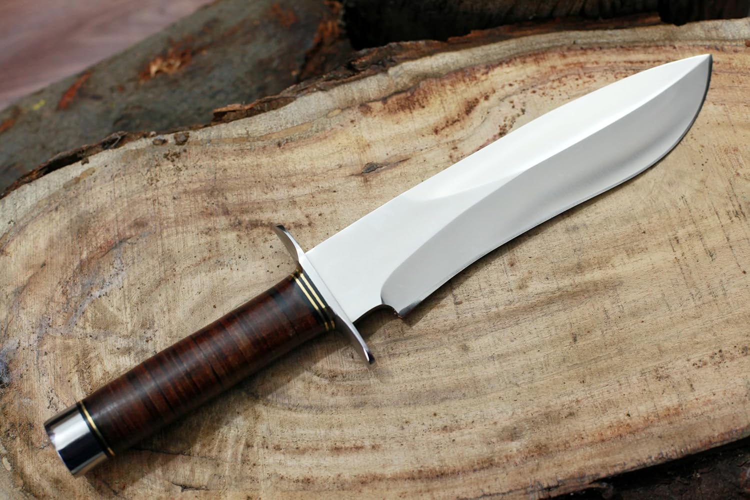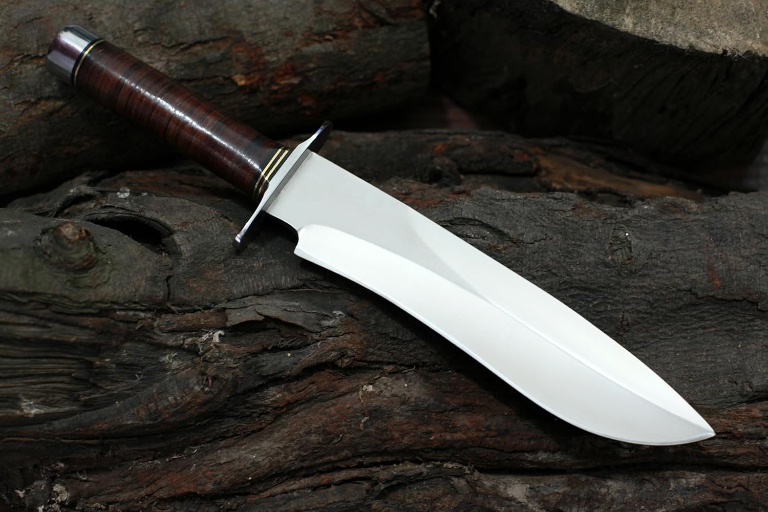The D2 Steel Sasquatch Bowie Knife features a 9-inch full tang D2 blade with ergonomic stacked leather handle. Ideal for hunting, camping, and survival, this handmade fixed blade knife includes a cowhide sheath and sharpening stone for safety, portability, and precision cutting.