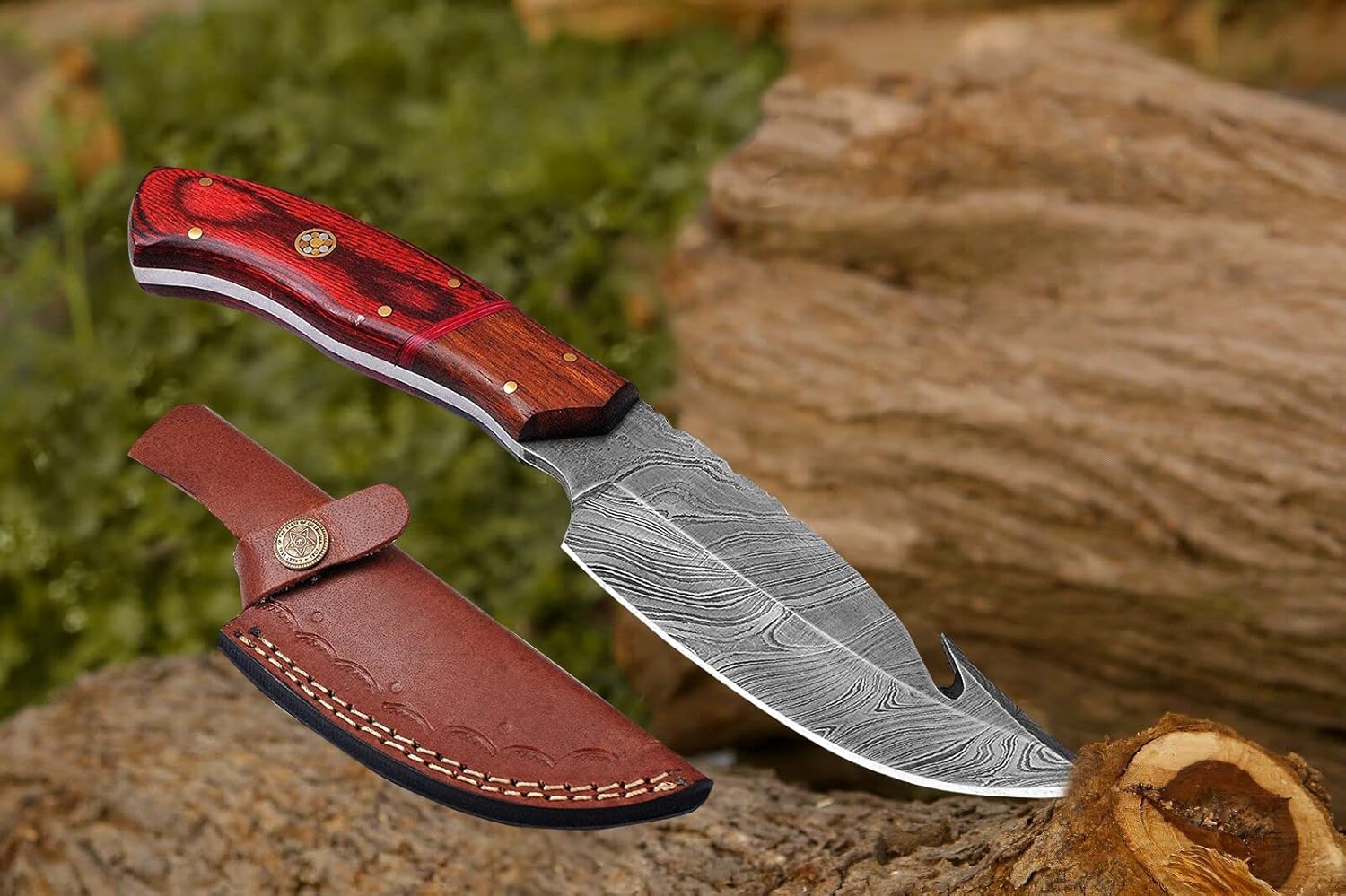 Gut Hook Hunting Knife Damascus Blade with Leather Sheath