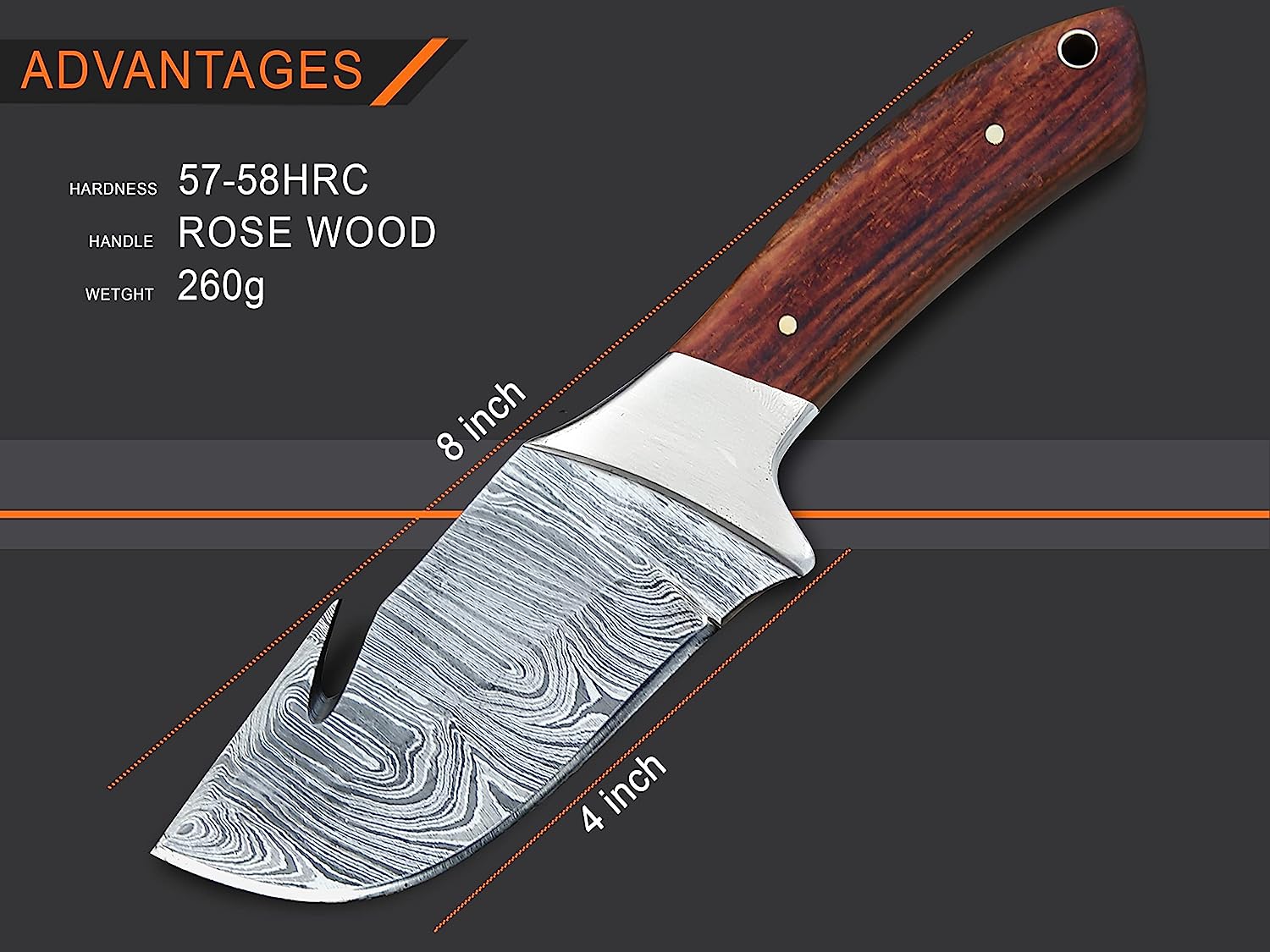 Damascus Knife Dimensions Total 8 inches 4″ Fixed Blade – 4″ inch Hand Crafted Wood style Handle. The hunting knives blade hardness is 58-60 with a double bevel razor sharp durable edge.