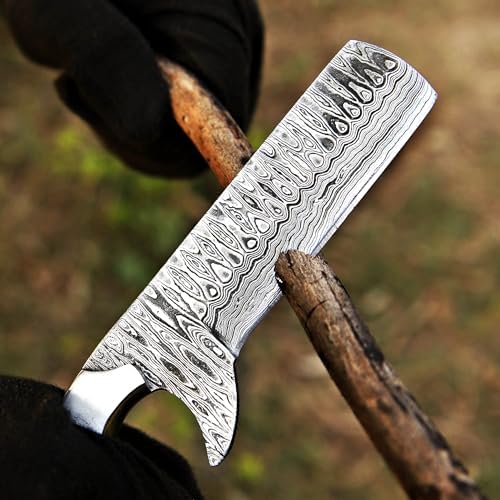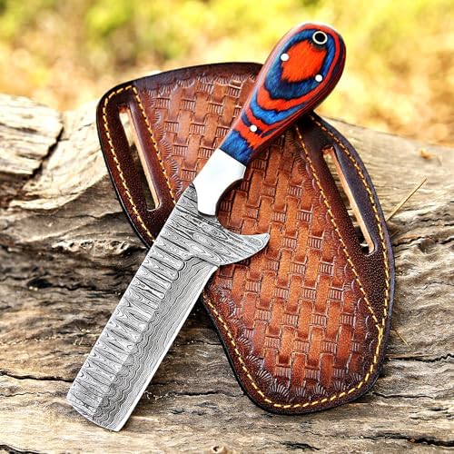 Each knife is individually handcrafted with a distinct Damascus steel pattern, giving it both functional excellence and collectible value. Full tang construction, premium handle materials, and a genuine leather sheath make this knife a high-quality outdoor companion and a perfect gift for hunters and campers.
