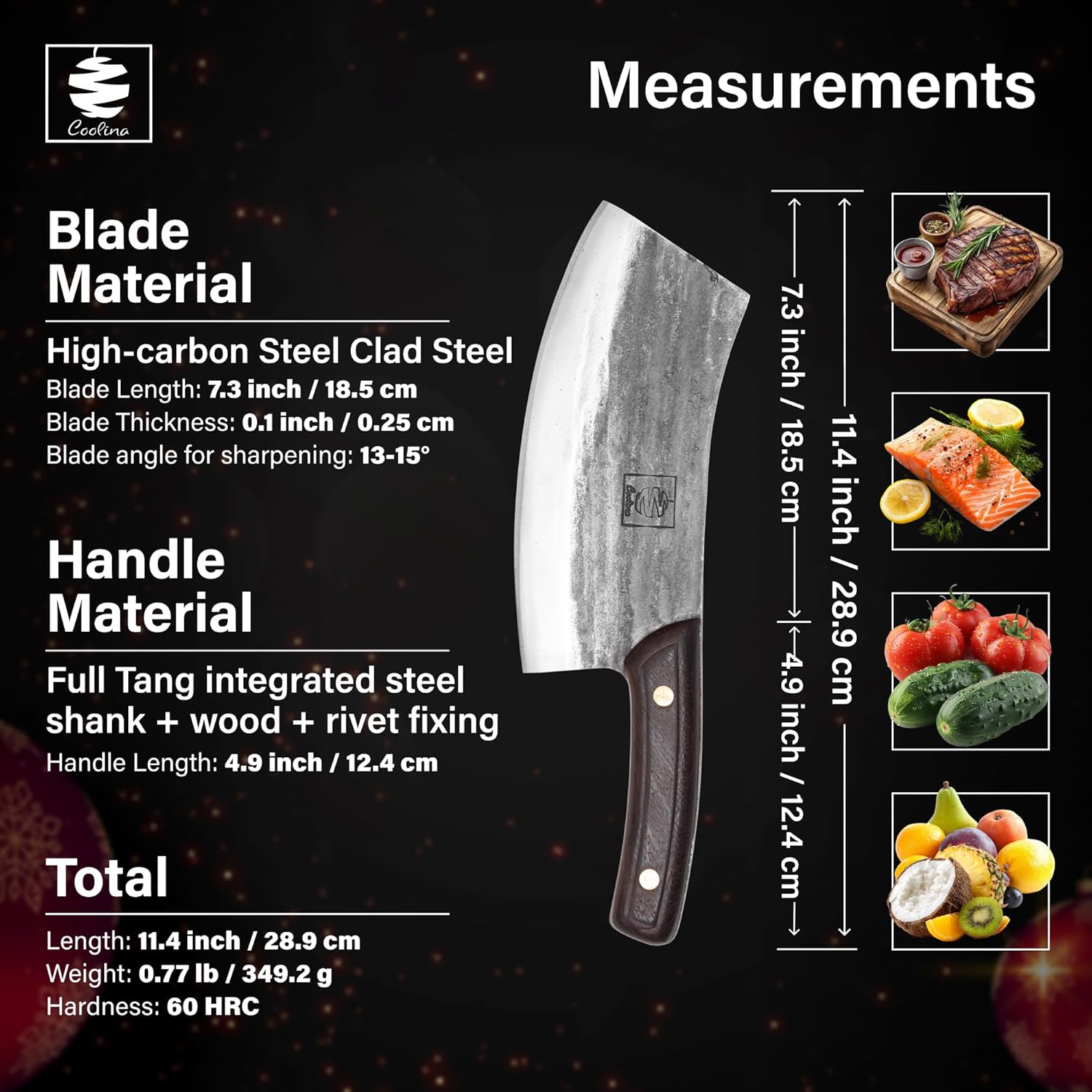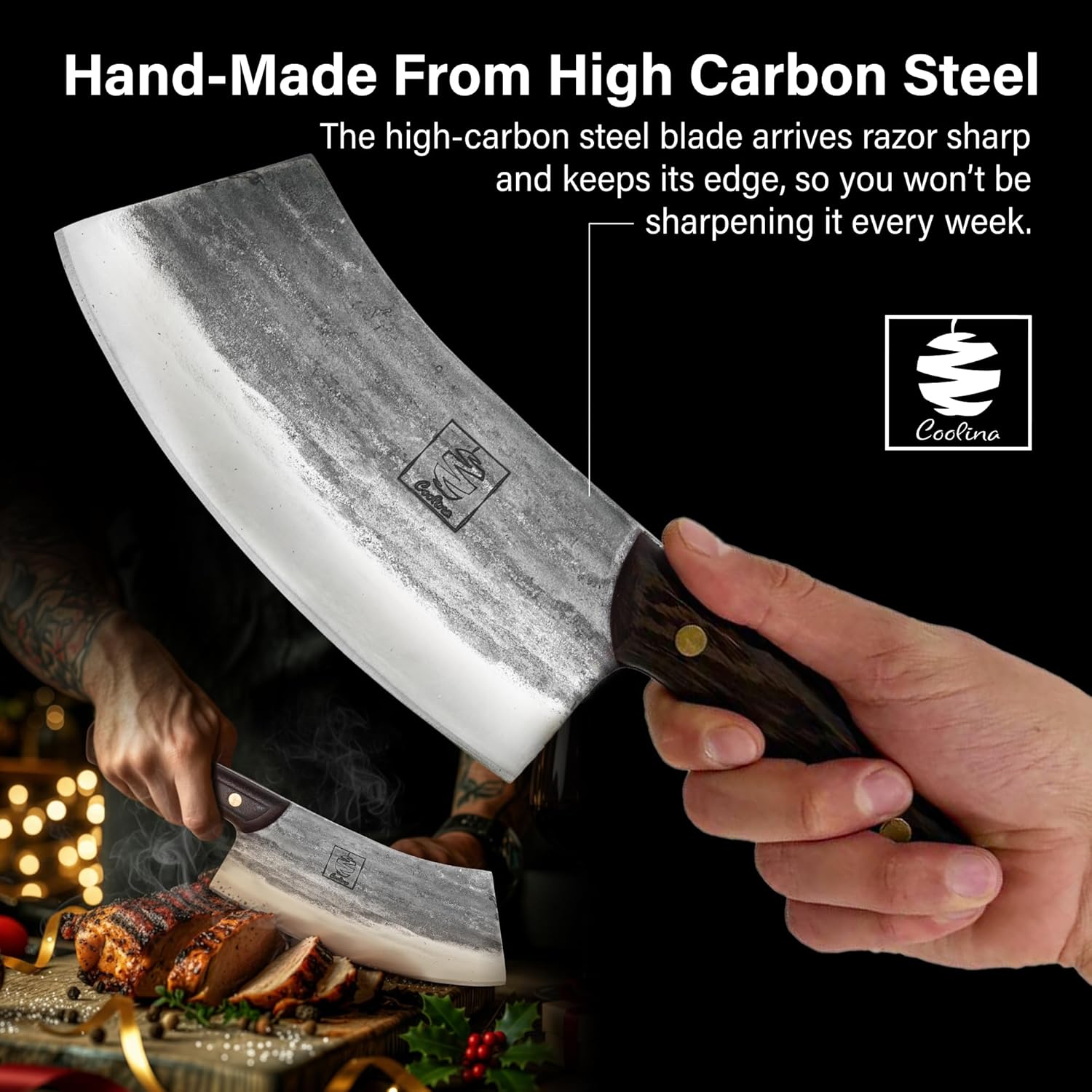 The COOLINA Handmade Chef Knife features a high manganese steel blade with razor-sharp performance. Designed for comfort, balance, and durability, it delivers smooth cutting for meat and vegetables, making it ideal for professional chefs and serious home cooks.