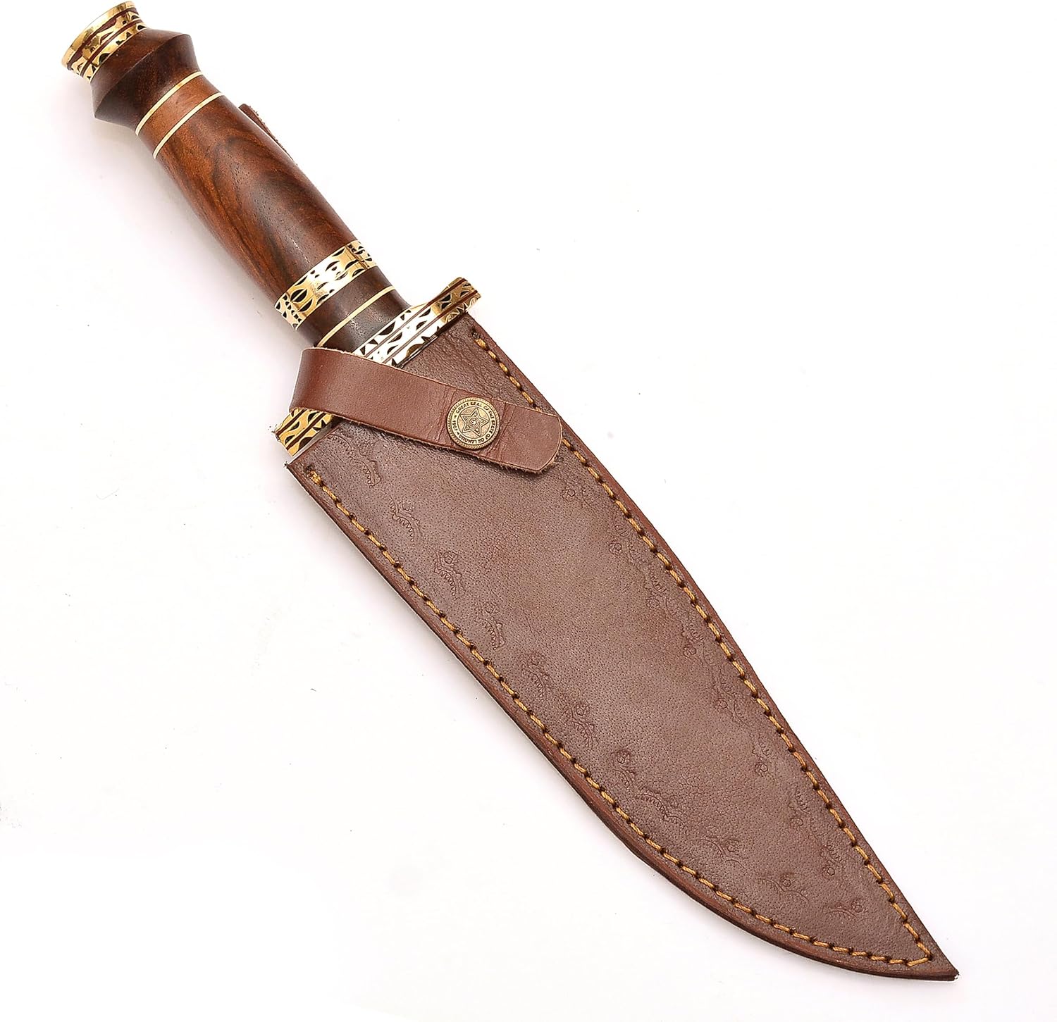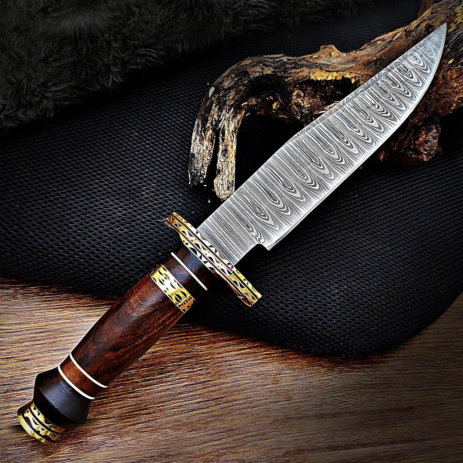 The Damascus Bowie Knife by RIGGER KNIFE is a premium handmade outdoor knife. Featuring a 13-inch overall length, 8-inch Damascus steel blade, and rosewood with brass guard handle, this fixed blade knife is designed for hunting, bushcraft, camping, survival, and everyday outdoor tasks.